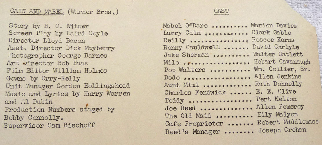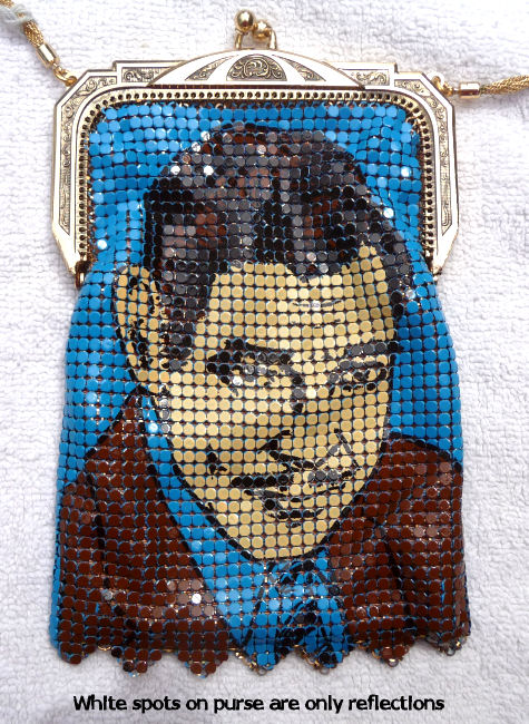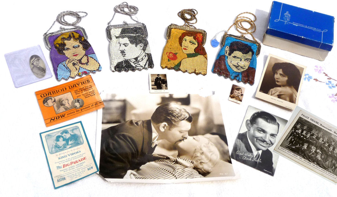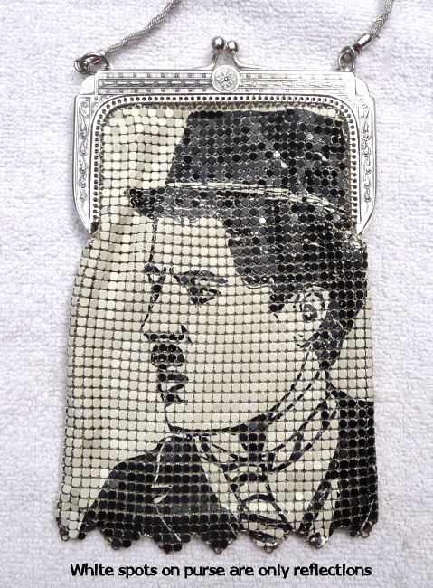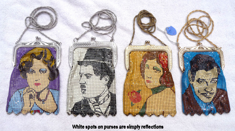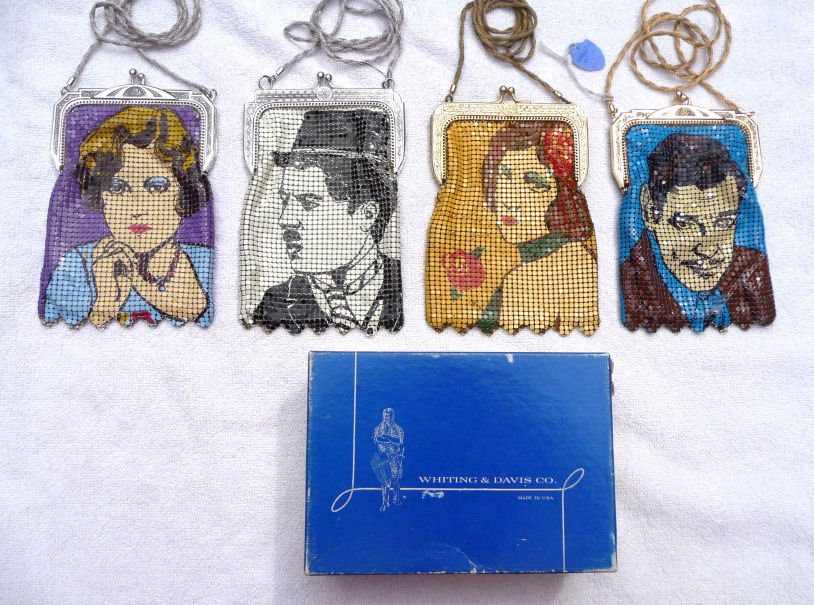 I am so proud to once again be able to offer another complete set of Whiting & Davis Heritage Collection Star Series mesh purses. My first set took over 10 years to acquire ... this set took me 5. In addition, this time I was able to acquire some terrific original memorabilia featuring the very stars on the purses ... my favorite being the large b/w photo of Clark Gable kissing Marion Davies from a 1936 movie called Cain & Mabel (with the full cast names on the back). As for the purses themselves, they were made by Whiting & Davis in 1976 to commemorate their 100th anniversary. Quite an achievement! The set consists of Clark Gable (famed actor), Renee Adoree (famous actress of silent films), Charlie Chaplin (The Tramp), and Marion Davies (actress and mistress of William Randolph Hearst). The Clark Gable purse has the original W & Davis tag as well as an original box which will hold all four purses. The condition of all the purses is exceptionally good. Each one is lined in silk and the linings are all in perfect condition with the only exception being Charlie Chaplin which is frayed in four spots, probably from rubbing as it appears unused. Enameling is also in perfect condition with no missing tiles. Each has a braided twisted mesh shoulder strap. Sizes will be mentioned on the pictures. The bonus items include: 1. 8" x 10" black/white photo of Clark Gable & Marion Davies from "Cain & Mabel", 1936* Sizes and specifics of each item will be listed on the photo pages. Please click on the top image to see the many photos of this wonder collector's set. *Click here to see a terrific video clip of the making of the movie "Cain & Mabel" with Clark Gable & Marion Davies. First time listed! (Click on pic for more photos.) |