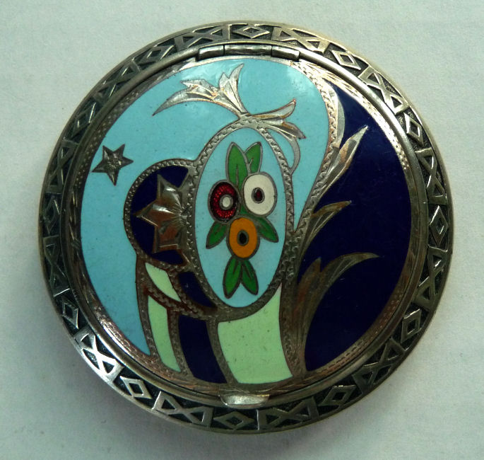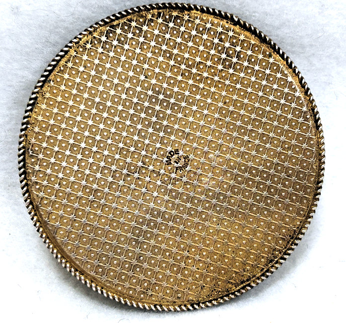 This lovely compact reminds me of those made by Fisher but it is unmarked so I have no idea who made it. The top is done in cloisonné style enamel (not guilloche) in lovely colors of cobalt, robins egg blue, pale green, dark green, yellow, white and red. It is just so pretty! The outer rim is done in deeply engraved x's and diamonds which repeats on the back edge. The back center portion is all richly damascened in a beautiful design. Inside the compact is a crescent mirror in the lid with an area for a rouge pat. The bottom has a removable tap-sift powder dispenser. All in all it is in excellent condition ... to the naked eye it is perfect ... with a loupe upon very close inspection you may see some crazing lines or a miniscule -- and I mean miniscule -- tiny flake but that is all. It's as close to perfect as you will get. Measures 2-1/8" diameter. (Click on pic for more photos.) |