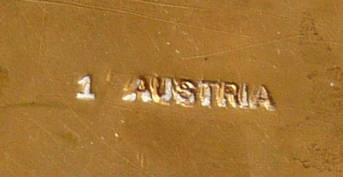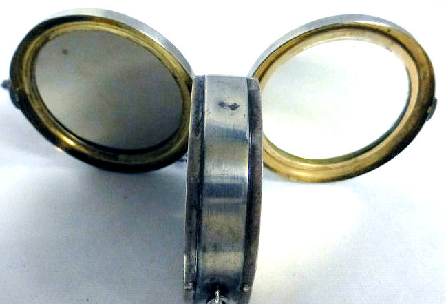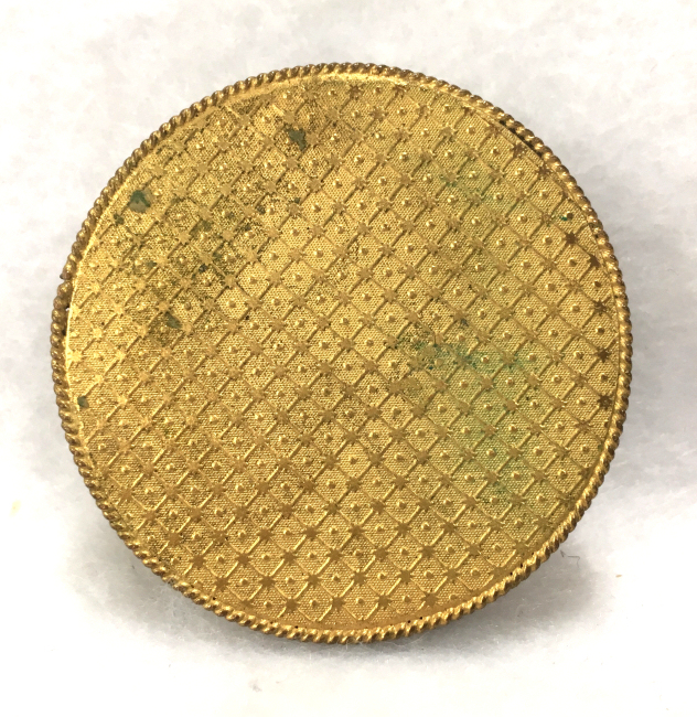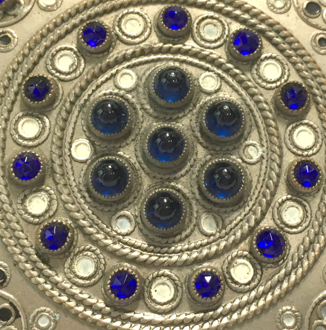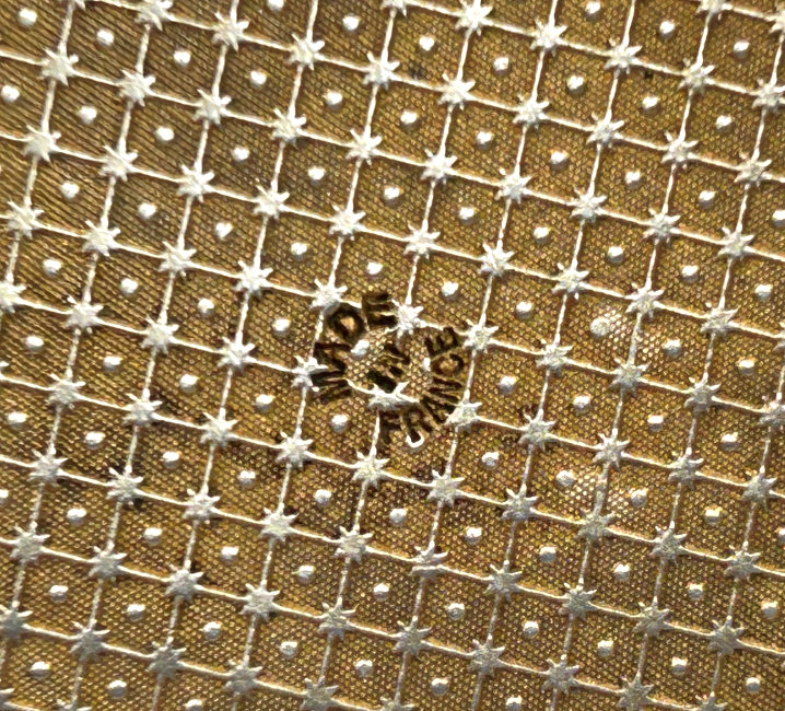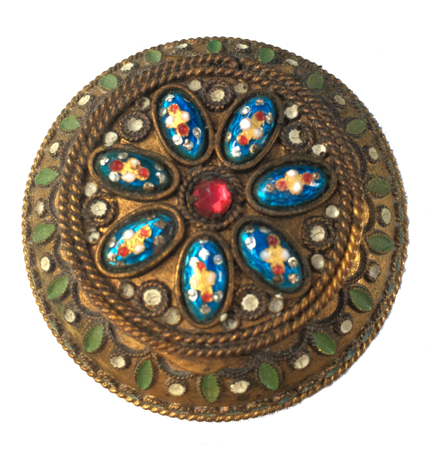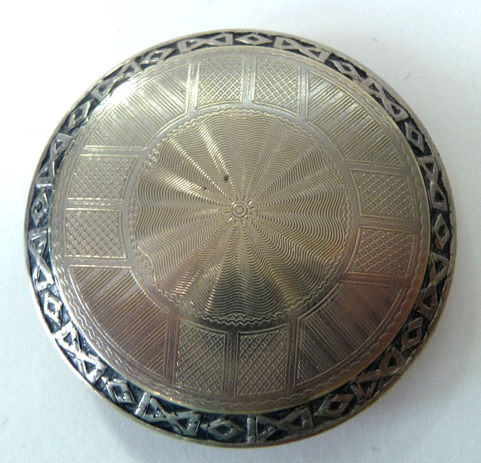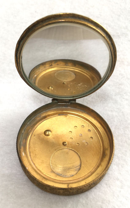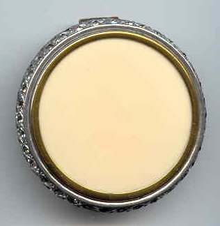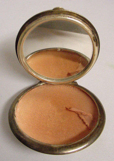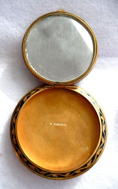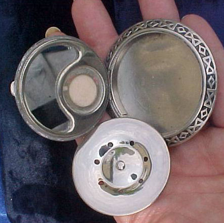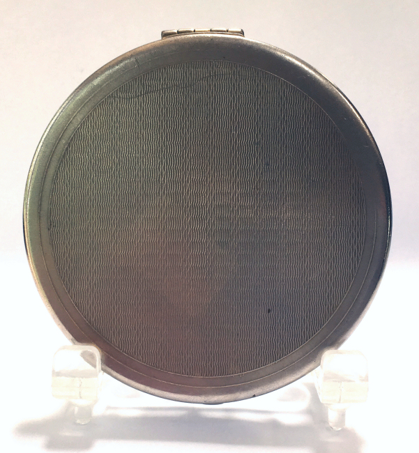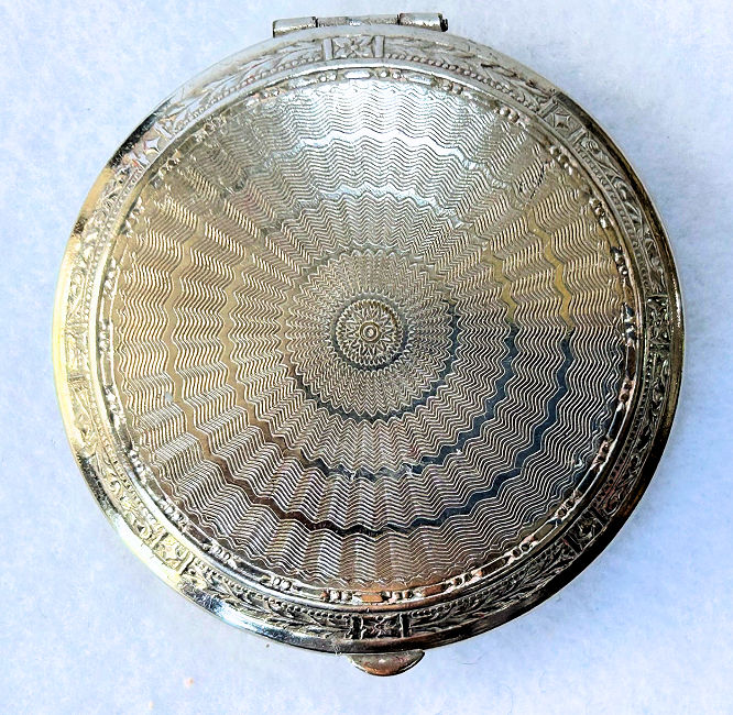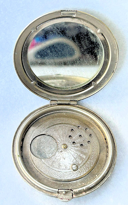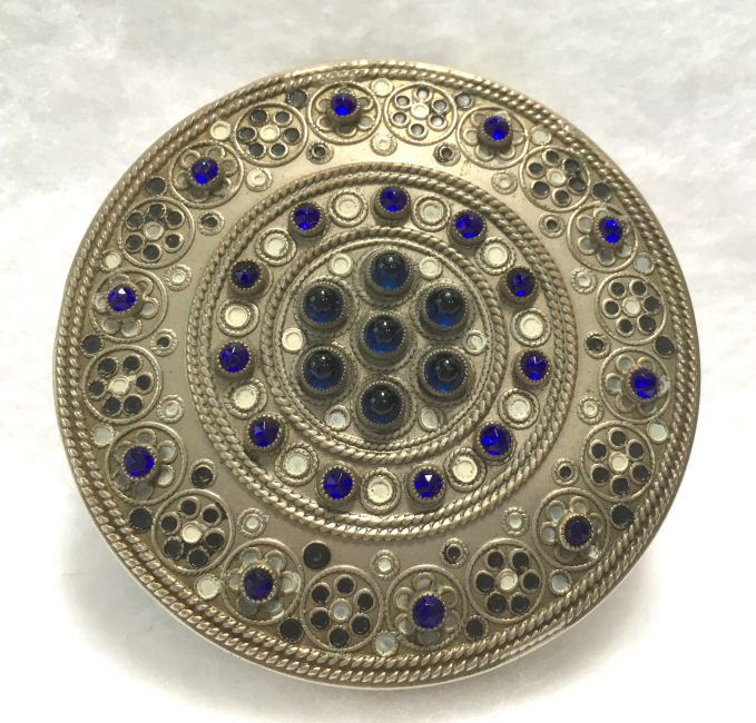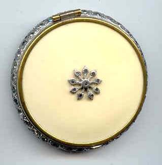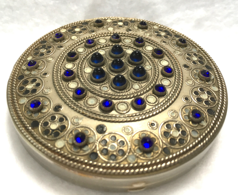 This compact is a mystery to me ... there are no marks on it whatsoever and it is a silver finish rather than the French bronzes and ormolu compacts even though the design on the surface is similar. It is still, nonetheless, a stunning compact with its beautiful rich cobalt jewels bezel-set on the surface. The center 7 are cabochon shaped and smooth while the other 21 are faceted. There is also white and charcoal grey enameling inset all over the top. It is quite lovely! The inside of the compact has a full mirror in the lid which does have a sliver of silver missing at the bottom. Otherwise it is clear and usable. The base has a rotating powder sifter in gold wash which resembles the Austrian compacts although I am not sure this one is. Measures 2-1/2" diameter x 1/2" deep (counting center jewel height). (Click on pic for more photos.) |