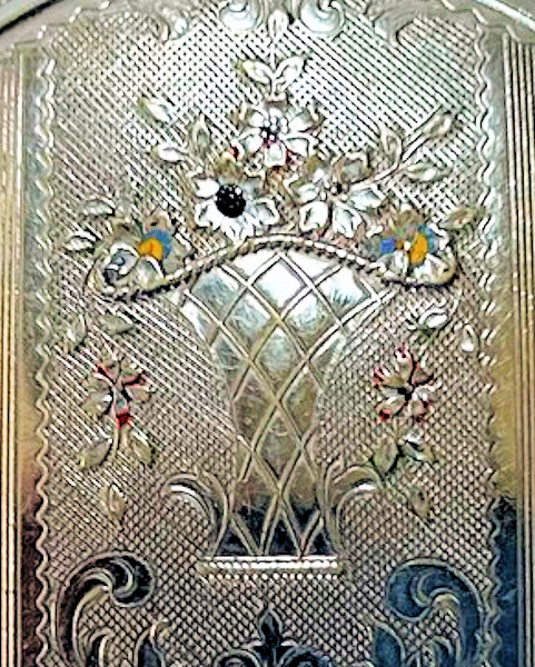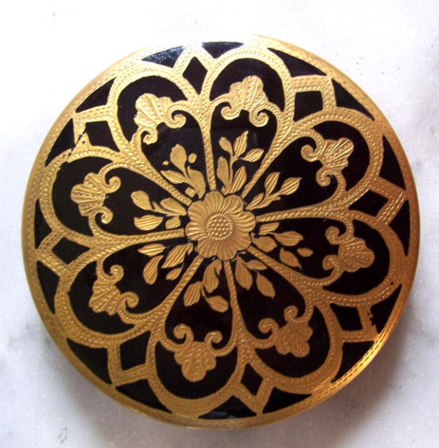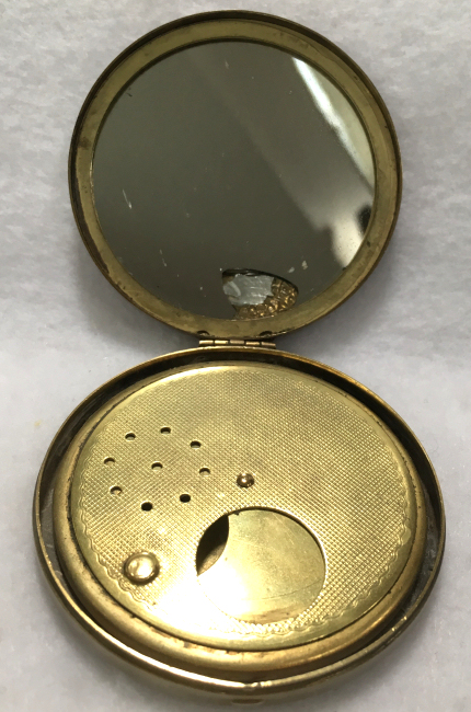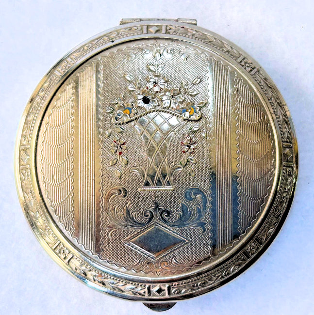 This is a unique little compact by an unknown maker which features gorgeous embossed and damascened designs on the front and back. The flower basket on the front even has tiny little enamel dots in the center of some of the flowers. The interior features a mirror in the lid with some fogging and a rotating powder sifter in the base. It came in a little chamois suede sleeve to protect it which snaps closed on the end. Overall in great condition and just a sweet and usable little compact. Snaps shut tightly. Measures 2-1/8" diameter. (Click on pic for more photos.) |