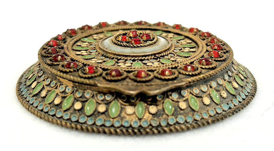 This is a gorgeous French jeweled powder compact made of gilt brass with elaborate enamel decorations. The lid features a highly ornate concentric design composed of twisted rope filigree borders and multiple accents. The center is a raised cluster of red jewels in a small rosette surrounded by a white enamel ring. Radiating outward from the center are bands of enameled decorations and another ring of red jewels. It is marked "Made in France" on the bottom. Inside is a beveled mirror in the lid and a powder puff in the base. It is in excellent condition overall with no missing jewels or damage, just age appropriate patination to the brass. Measures 2-1/2" diameter. (Click on pic for more photos.) |