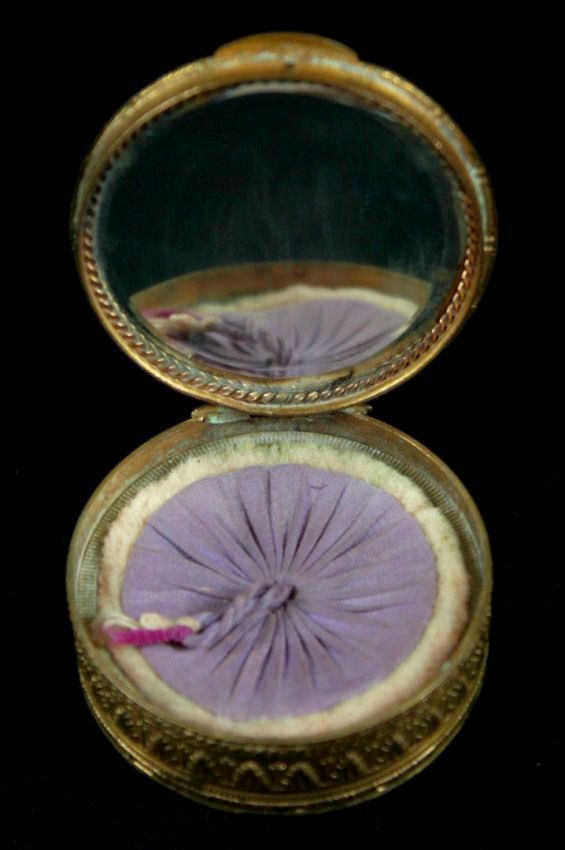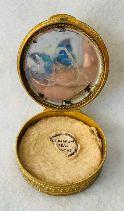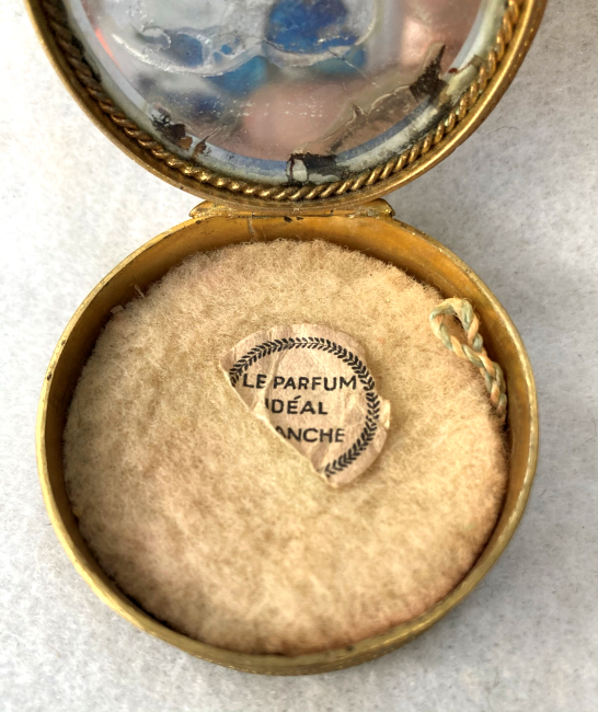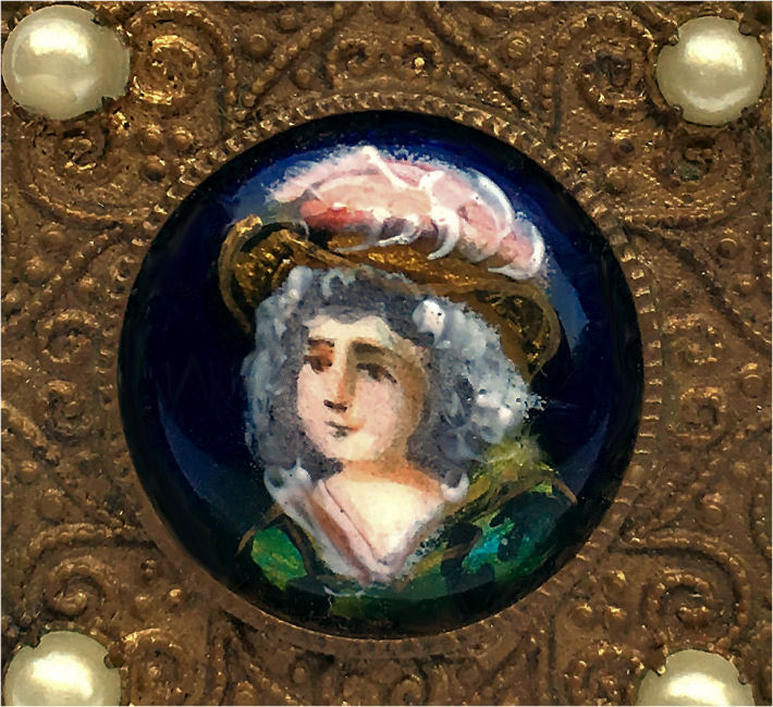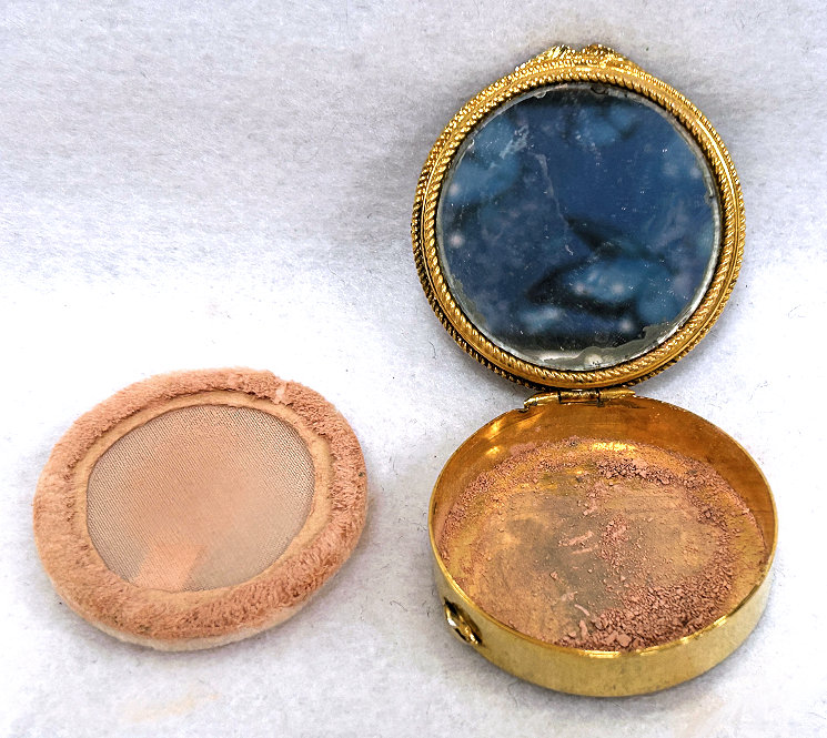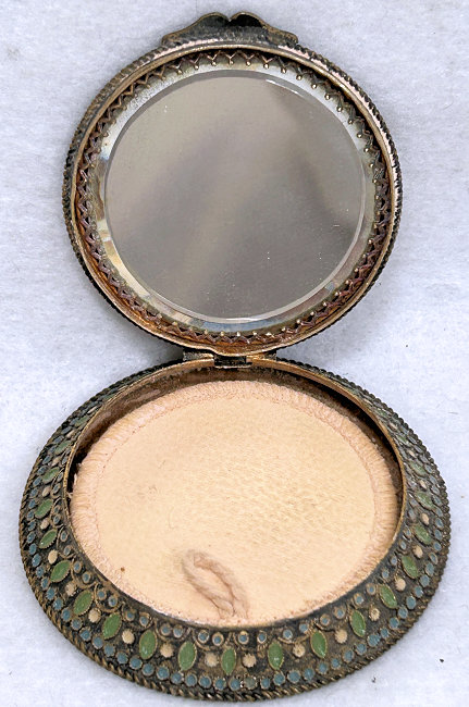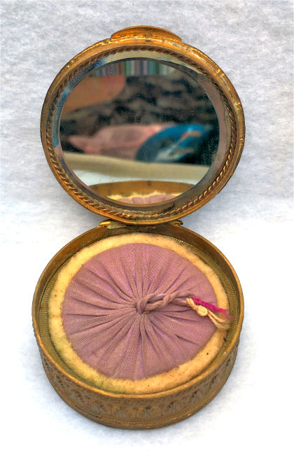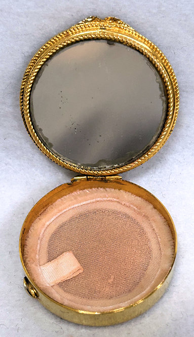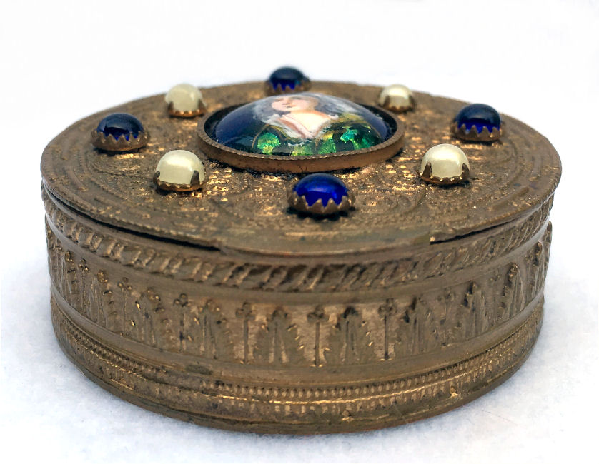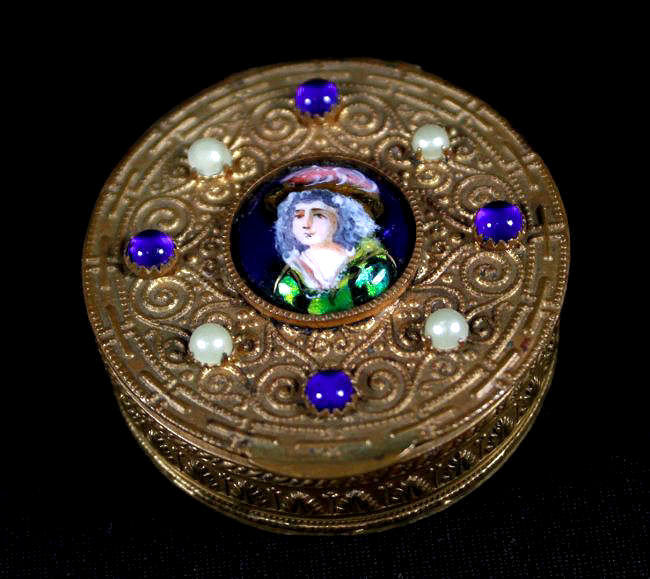 This is a stunning French bronze compact with a raised center medallion featuring a hand-painted portrait with foliate dress on a cobalt background. The ornate bronze surround has prong-set sapphire and pearl jewels to accentuate the center portrait. They are all intact and the portrait is in excellent condition as well. When you open the compact, the inside features a nicely beveled mirror in the lid with a ropetwist bezel ... some loss to the silver on the outermost edges only. There is a darling purple ruched wool puff in the base and a removable powder pot which is probably a later insert. Bottom of the compact is marked "Made in France." It is a truly beautiful piece! Measures 1-7/8" diameter x 3/4" deep (counting center vignette height). (Click on pic for more photos.) |