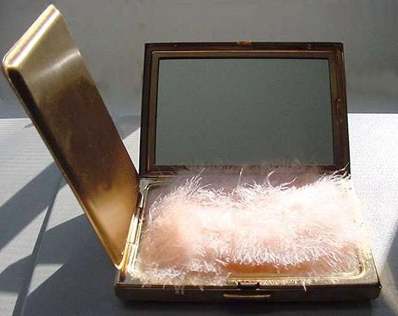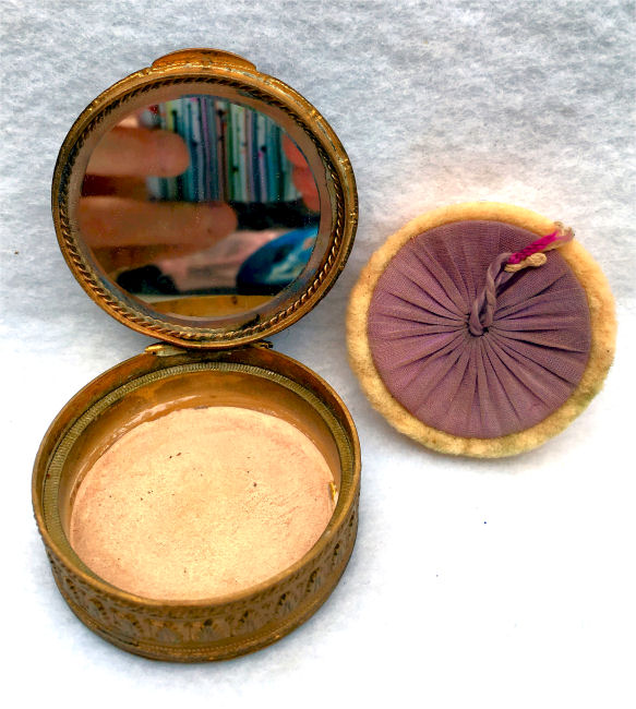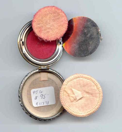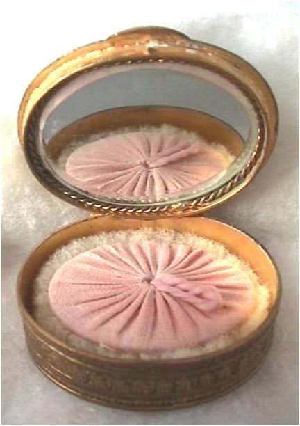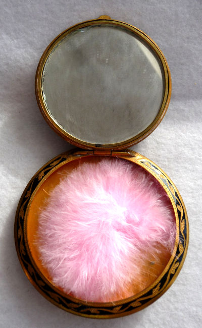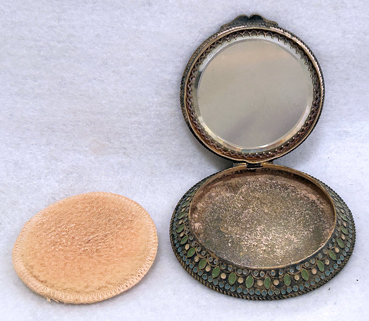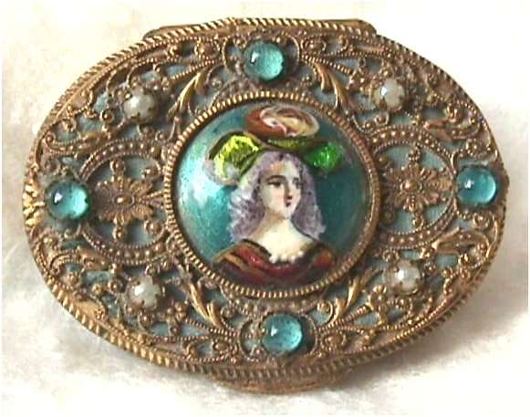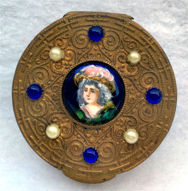 Here we have one of my personal favorites and one I may very well decide to keep. This fabulous little piece features a hand-painted portrait on a raised center enameled medallion and is surrounded by pearls and turquoise jewels. The top is delicately filigreed in intricate designs through which can be seen a teal-colored background. But my favorite part is the interior ... a beveled framed-in mirror can be found in the lid and the most darling little pink shirred lambswool puff still nestles in the base. Bottom of the compact is marked "Made in France." It is in excellent condition! Measures 1-7/8" long x 1-1/2" wide x 5/8" deep. (Click on pic for more photos.) |