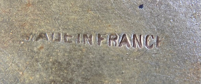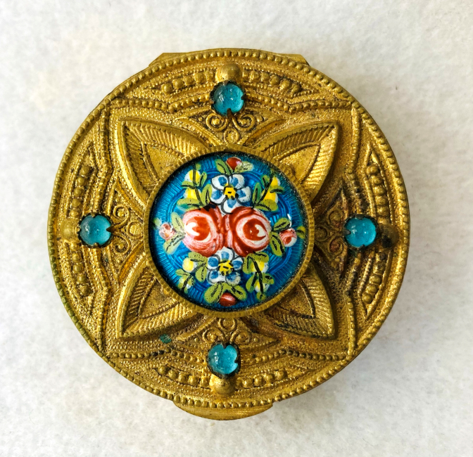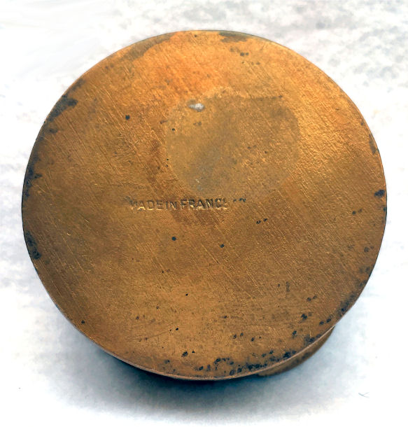 Here is another lovely French bronze compact with a center vignette of hand-painted enamel roses on a turquoise blue background. There are four turquoise jewels surrounding this. The bronze case is extremely detailed with deep designs on the top and pretty designs around the edge. Inside the compact is a beveled mirror in the lid which is considerably fogged and not really usable. There is a perfectly fitted puff in the base with a paper label on it which may or may not be original but it is definitely vintage; however, I am assuming it to be original due to how perfectly it fits inside the case. The bottom is marked Made in France. Overall, with the exception of the mirror fogging, it is in perfect condition. Measures almost 1-3/4" diameter x 5/8" deep (counting center vignette height). (Click on pic for more photos.) |
