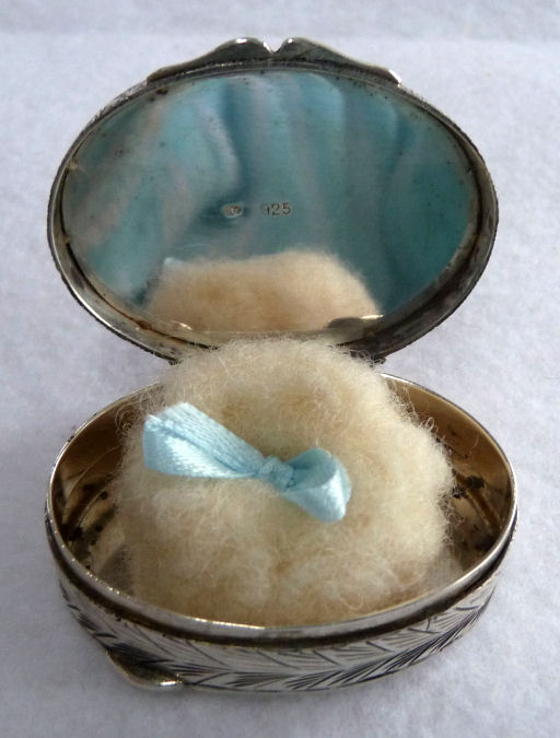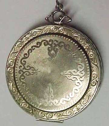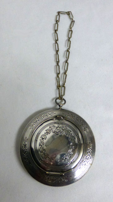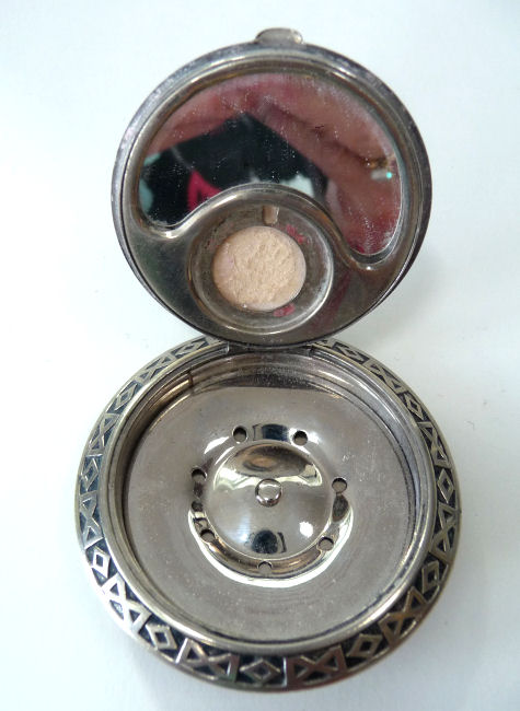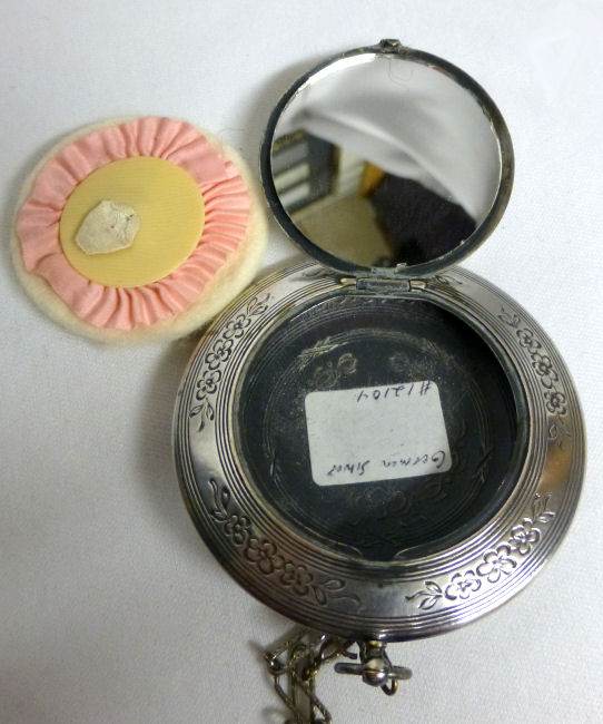This is a very pretty silver compact that is not marked sterling but it has a pretty significant silver content as it tarnishes as sterling. It is engraved on both the front and back with a pretty flowering vine pattern which is very Victorian in design. The inside is open for loose powder and has a mirror in the lid. But the best part is the sweet little original puff inside with ruching and French ivory top which holds a little ribbon pull. So cute! Excellent condition throughout. Measures 2-1/2" diameter. (Click on pic for more photos.) |