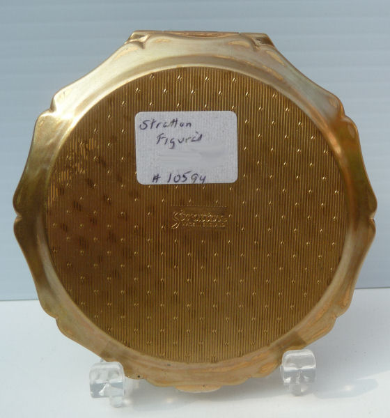Here we have another rare and pretty Stratton figural compact with another romantic couple on the front. This young pair appears to be relaxing in a formal garden of some sort with beautiful architecture ... even a fountain (note the head on the far right side with water pouring from the mouth in the wall). This compact has been used and still has the original powder pat inside. Surface shows some very minor superficial scuffing visible upon close inspection and when held to light. Scuffs do not go through the scene. Measures 3" diameter. (Click on pic for more photos.) |