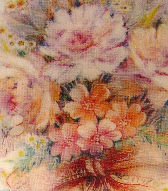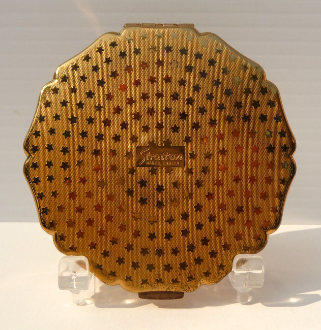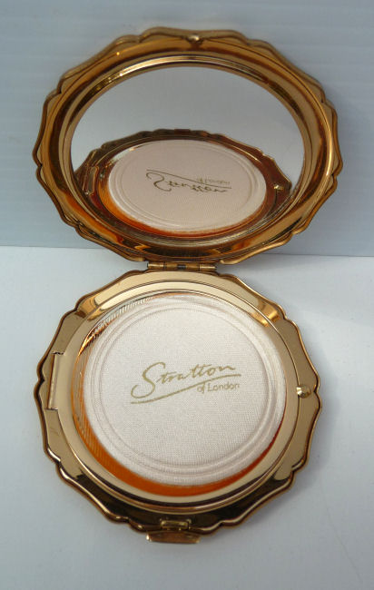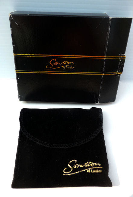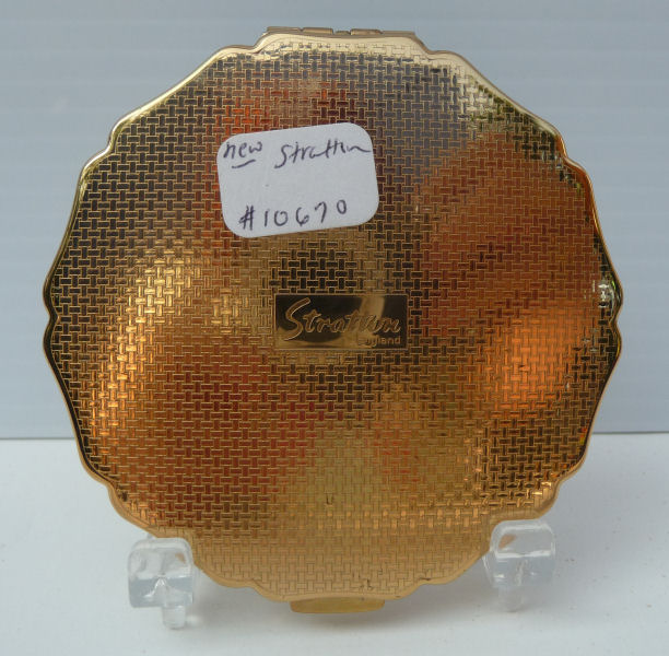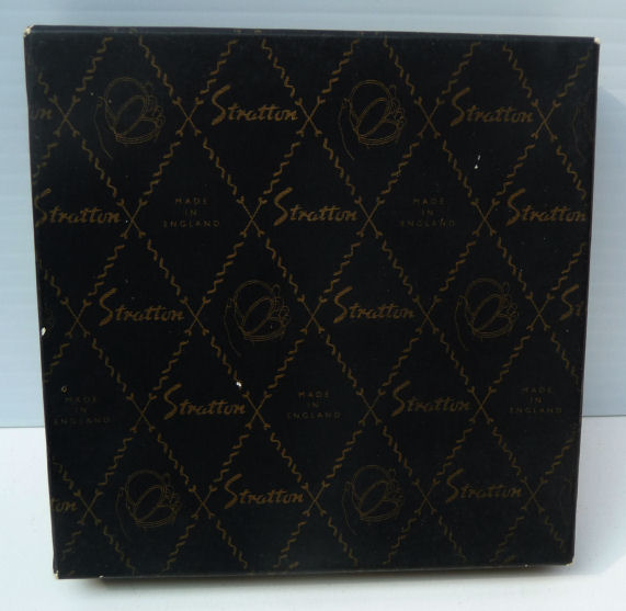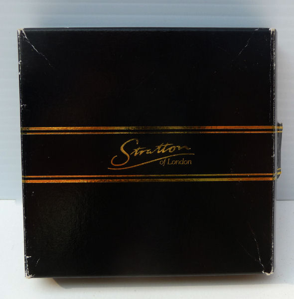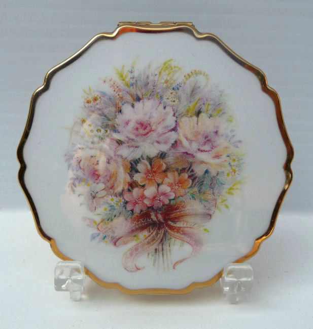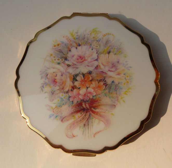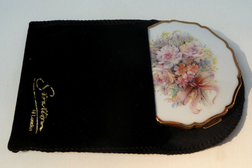 This lovely Stratton compact made in England has a beautiful "painting" on the front of a bouquet of wildflowers in pastel colors which are so pretty. This is a later model compact as the box has a FAX number on the outside. The design on the back of this one dates it to the early 1990's. Even so it is a beautiful compact in white enamel on the front with a scalloped design. The compact is in its original box with original black velvety pouch. The original puff and screen are intact inside and never used. Measures 3" diameter. (Note: any Stratton compact 20+ years old is considered vintage) (Click on pic for more photos.) |