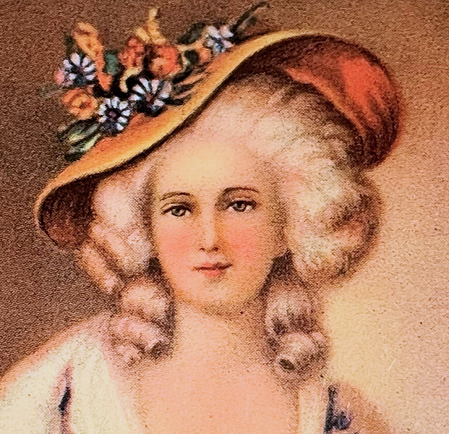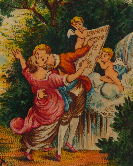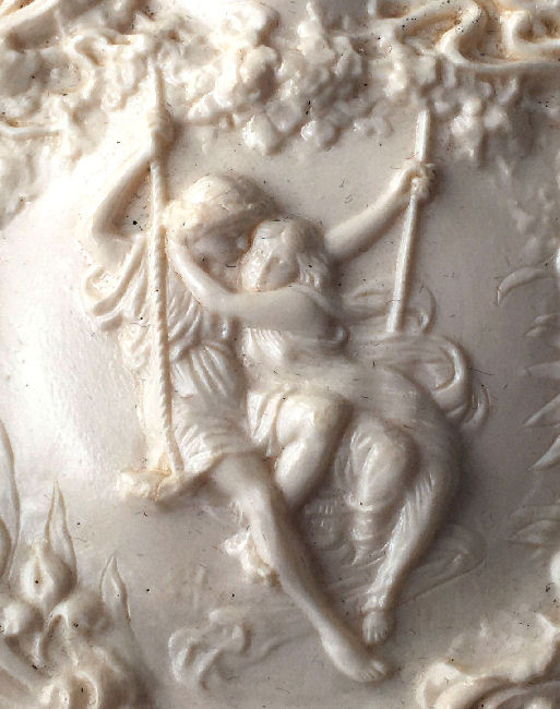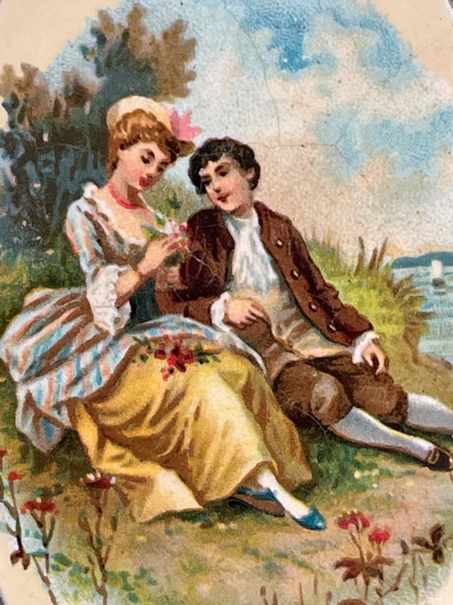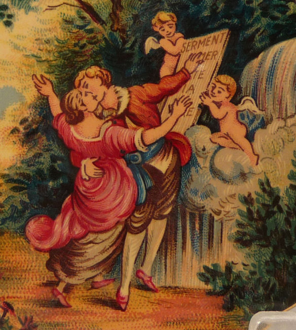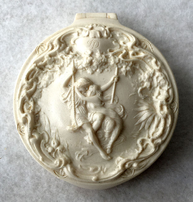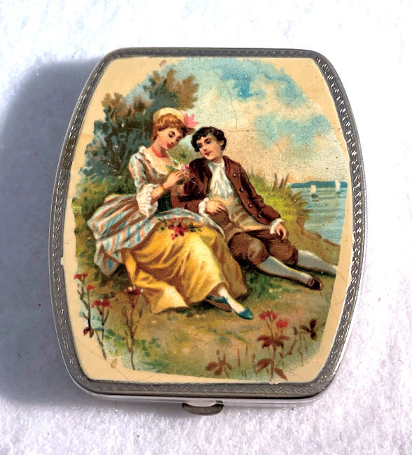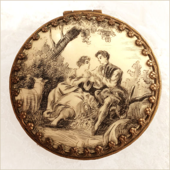 This is a very unusual compact and one I have never seen another like. I am not even sure what the lid scene is made of ... can't tell if it is paint, transfer, enamel or what. There is some faint crazing visible if you look closely. So I can't be sure what it is. Regardless, it is a lovely scene reminiscent of Nicolas Lancret's pastoral paintings of couples in similar pose. Inside the lid is a metallic mirror which opens to reveal a rouge pot beneath. And the base has a covered powder well (lid on powder well does not snap tightly). Back of compact is done in cream color to match the front but again, I am not sure exactly what is is. I would assume the back is polychromed or painted. Overall it is in excellent condition with exception of the crazing which is due to age and personally I like the way that looks as it gives it aging. This is a small compact measuring only 1-3/4" x 2". (Click on pic for more photos.) |