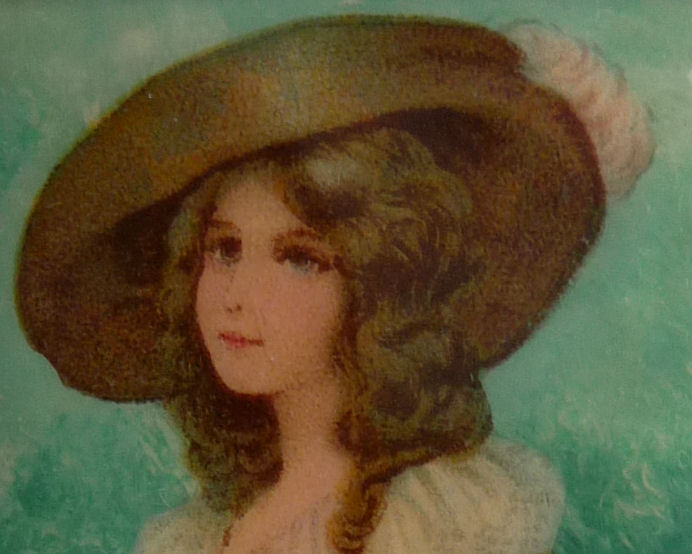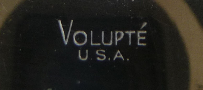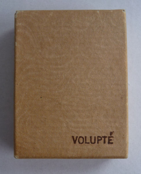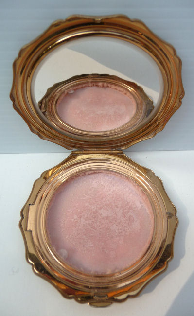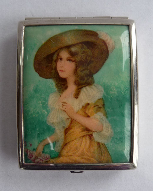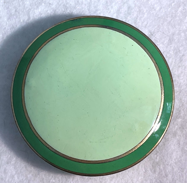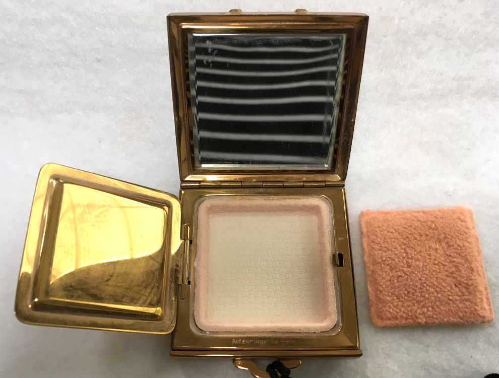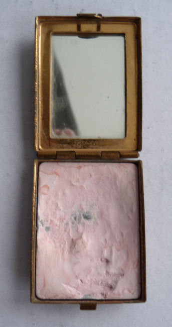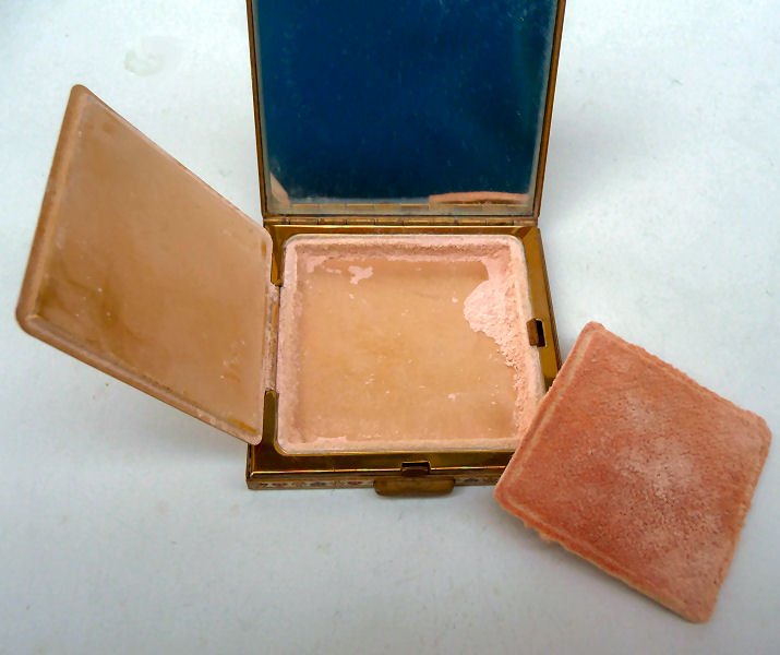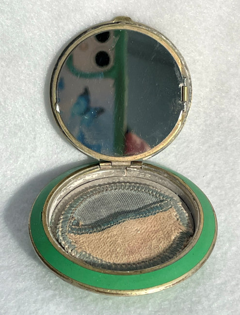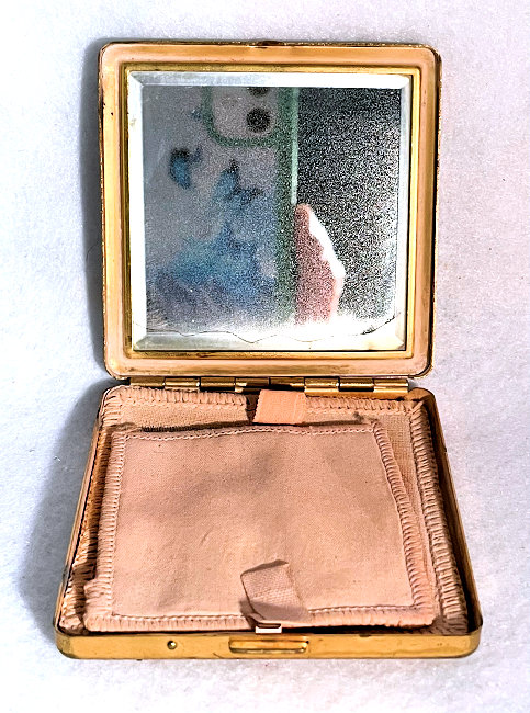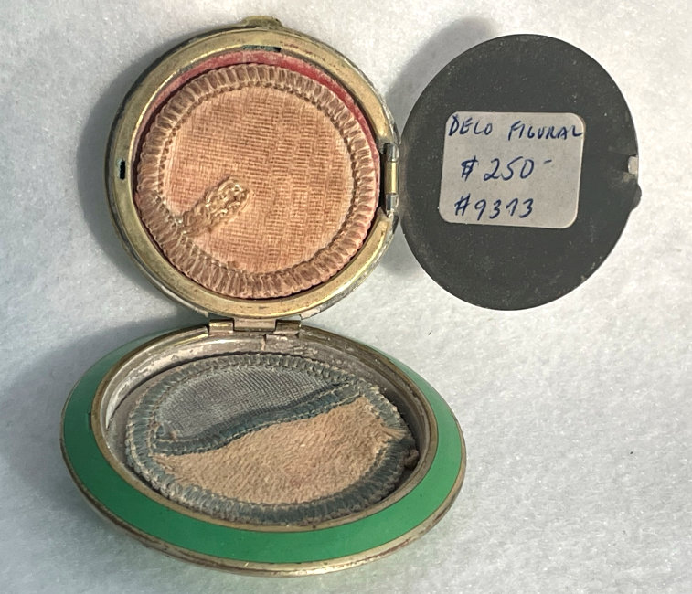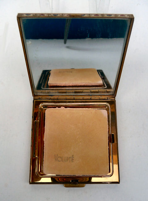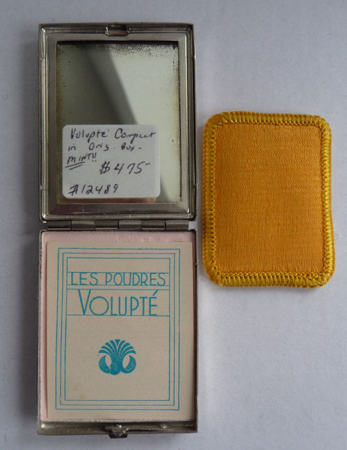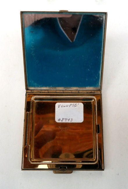 I don't often buy compacts from this era (1940's) but this one was just so delightful that I couldn't pass it up. It has a fully enameled front depicting a lovely lady in Sunday best with wide brim hat with a feather flourish. It is still in its original box marked Volupte' on the lid. The compact itself is in mint unused condition. When you open it, there is a mirror in the lid. The base has the original gold puff and paper liner protecting the powder beneath. Please see close-ups for both sides of this paper. The only apology is some foxing around the top of the mirror ... this is strictly age appropriate and not from use. Back of the case is done in green enamel with some very minor scuffing simply from being in the box. It is a fabulous compact! Measures almost 2-1/8" long x 1-5/8" wide. (Click on pic for more photos.) |