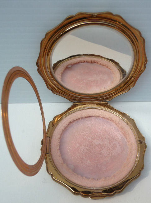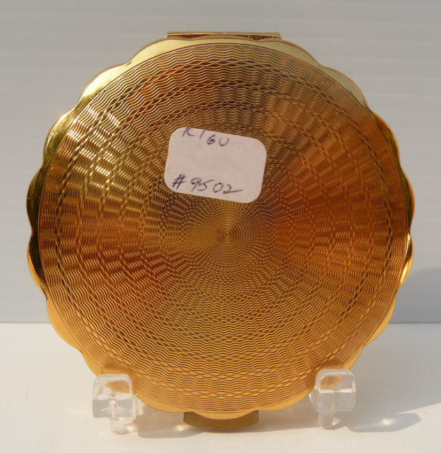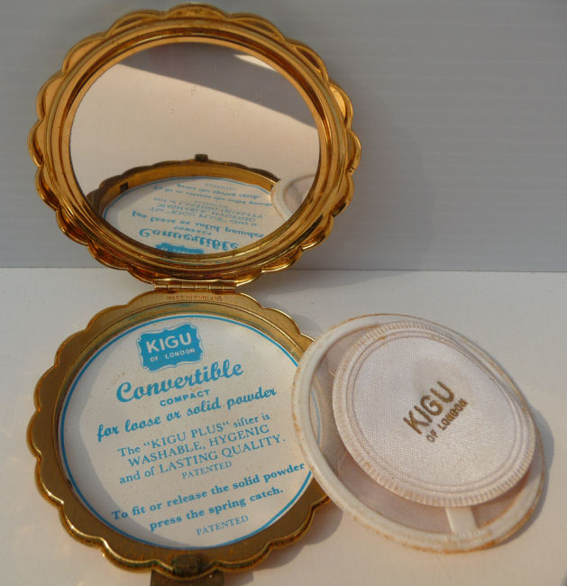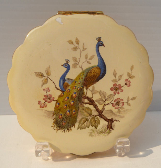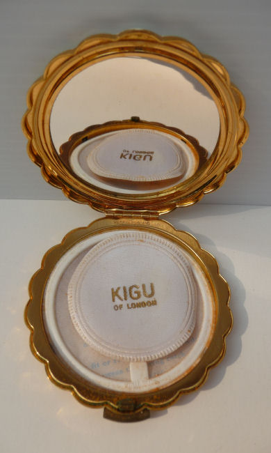Here is a very pretty Kigu compact with two full-bodied peacocks gracing the front. The scene is just so peaceful and pretty. I also love the scalloped edge on this. The compact has never ben used and retains the original puff inside (some foam loss due to age), powder screen and the original paper insert. There is a full mirror in the lid and the back is done in gorgeous concentric rings ... very pretty. This compact would be mint condition with one exception ... on the front at the very top left edge is a tiny flake in the cream enamel and the white backing shows through. It blends in so well that you almost have to be told it is there to notice it. That is the only reason this compact is priced so low. It's a beauty! Measures 3-1/4" diameter. (Click on pic for more photos.) |