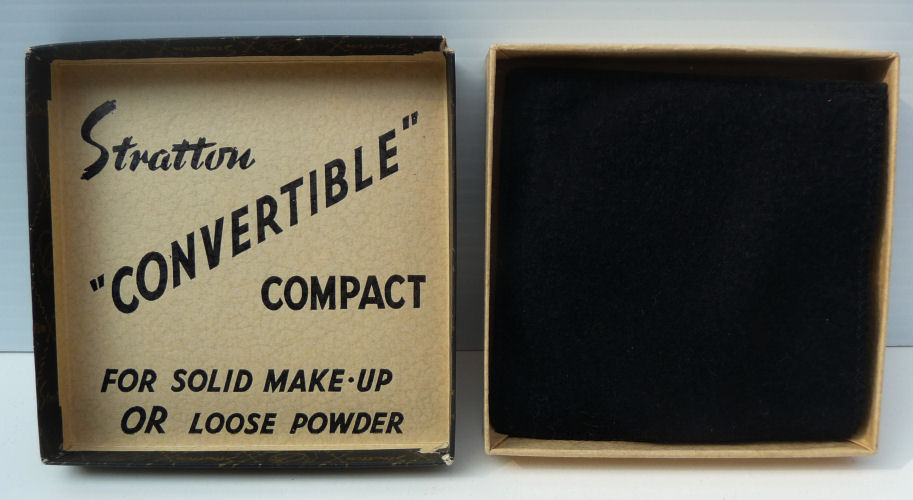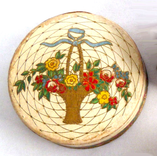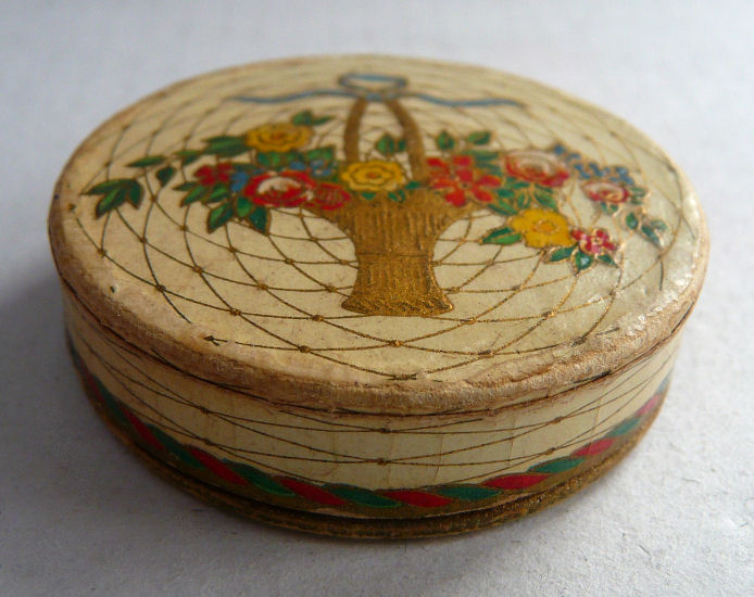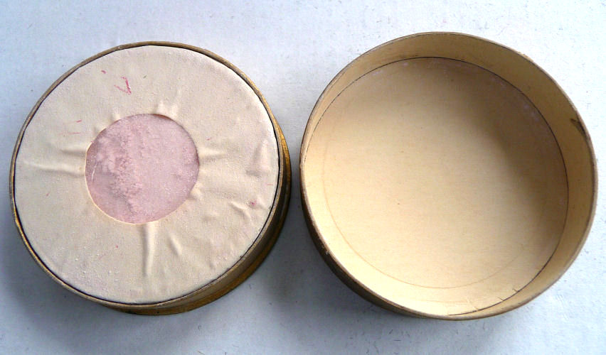 These old paper powder boxes are so neat to add to a collection of more expensive compacts ... the graphics on them are just so very cool and due to the fragility of the items, much more difficult to find in this condition. Made by Norida, this all-original powder box contains loose powder still sealed inside. Other than some typical aging to the box (discoloration mainly on the side), it is in excellent condition throughout. Especially the graphics on the lid which are pretty near perfect. Measures 2-1/2" diameter x 3/4" high. (Click on pic for more photos.) |