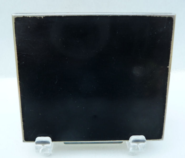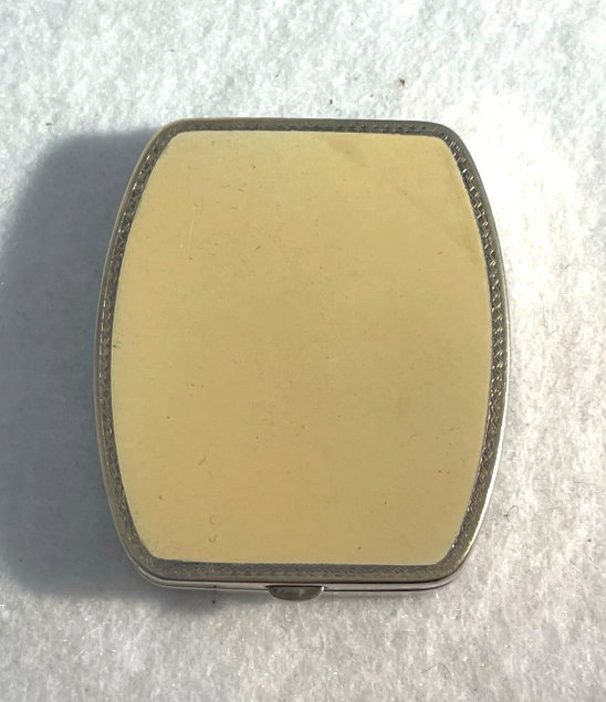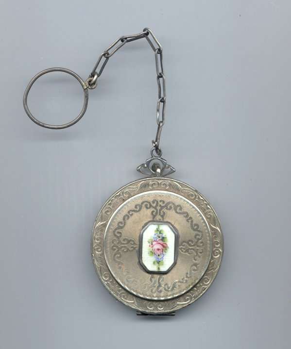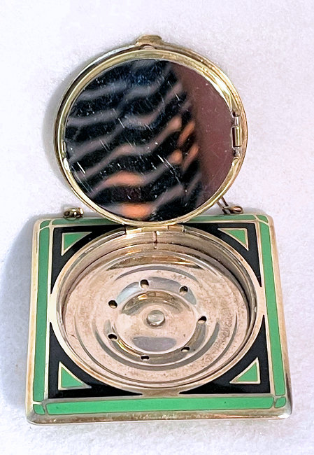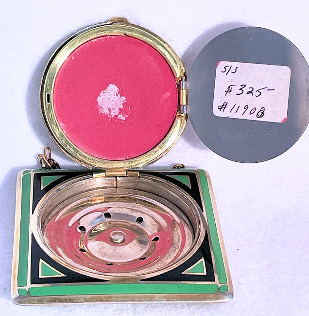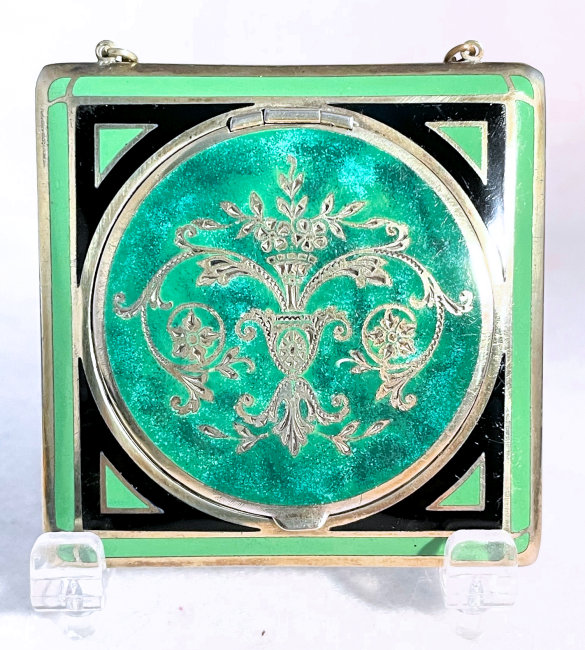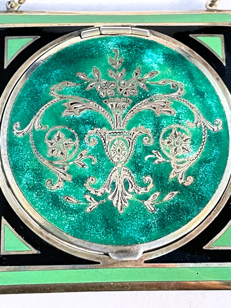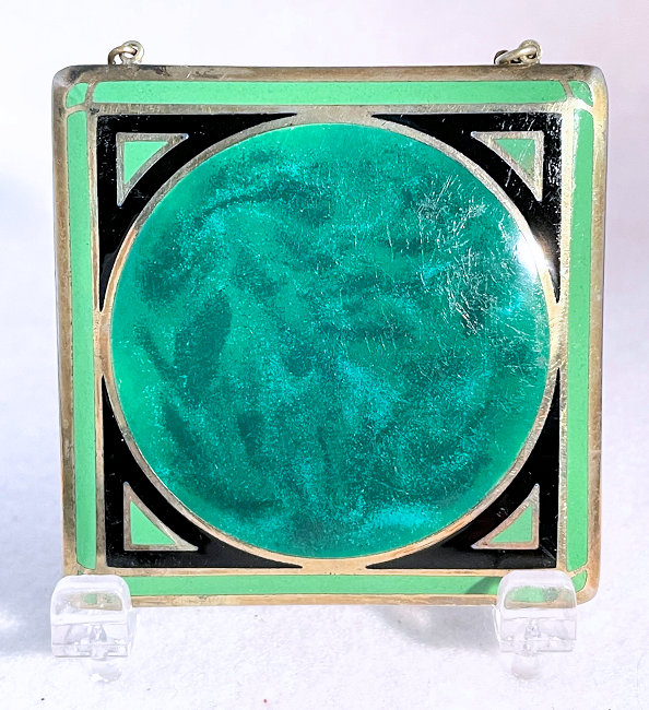 This lovely compact has no maker's mark so I don't know where it was made but more than likely in the New England area as so many of these were. The front of the case is done in very pretty faux malachite with champleve designs in the center. This is surrounded by black and green enamel in art deco influence. The back of the compact is the same faux malachite enamel with black and green enamel surround. metallic mirror which opens to reveal a rouge pot with rouge still inside. The base holds a rotating powder sifter. Overall it is in very good condition with the top being excellent and the base having minor scuffs from usage and age. No serious scratches or anything that goes into the enameling. Comes with wrist chain for carrying. No maker's marks or marks of any kind that I could find. Measures 2-1/4" square. Chain handle has 2-3/4" drop. NOTE: I purchased this as being sterling silver but since I am not able to find a mark on it to prove that, I will not claim it is. However, it does tarnish like silver so perhaps I am just missing the mark as these can sometimes be quite tiny. (Click on pic for more photos.) |