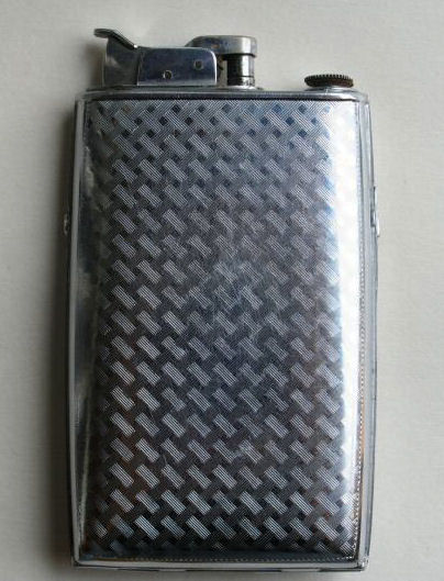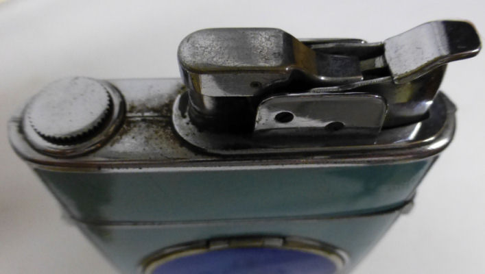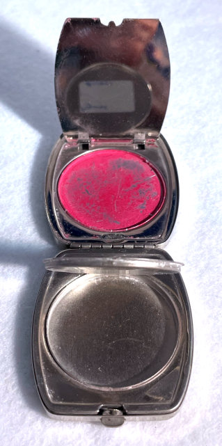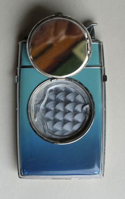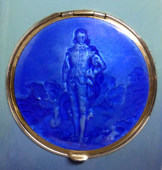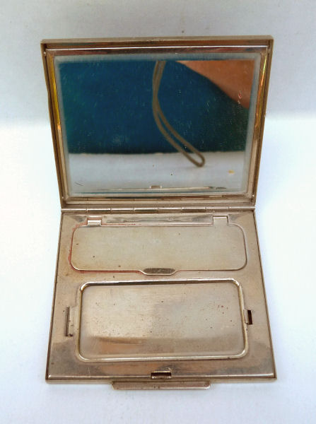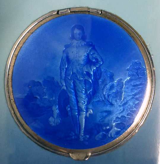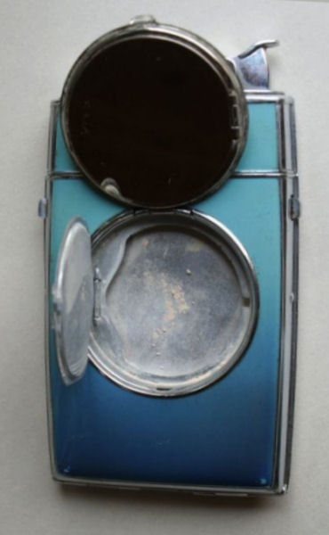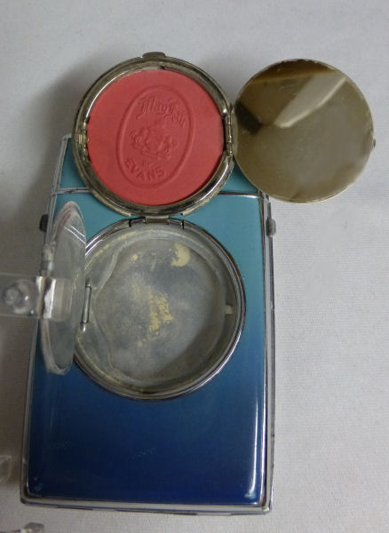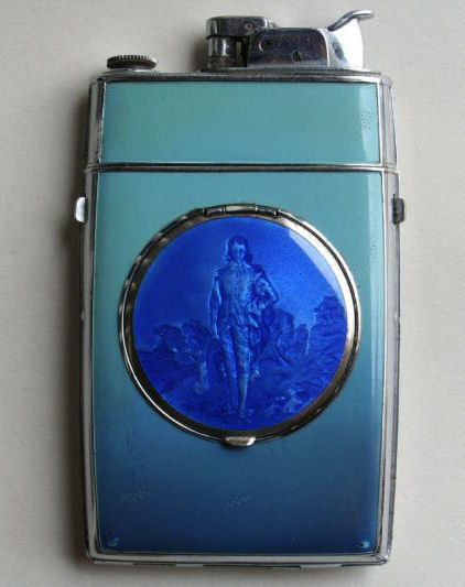 I have had this beautiful combo lighter/compact in my collection for some time now. I just love the rich blue enameled Blue Boy design on the front. It was made by Evans and is a Trig-A-Lite combination cigarette case/ lighter/ compact. The compact opens to reveal a covered powder well in the bottom portion and a metallic mirror in the lid which opens to a brand new unused rouge pat marked Mayfair by Evans. Conditon is very good with the exception of two tiny rub marks on the bottom front corners (visible in pics). The enameling is all perfect as are all the other components of this lovely item. I do not know if the lighter works as I do not smoke and do not test these. I buy them for the compact appeal. Measures 2-1/2" x 4-3/8" overall. Compact portion is 1-7/8" diameter. Be sure to look at all the photos of this wonderful piece! (Click on pic for more photos.) |