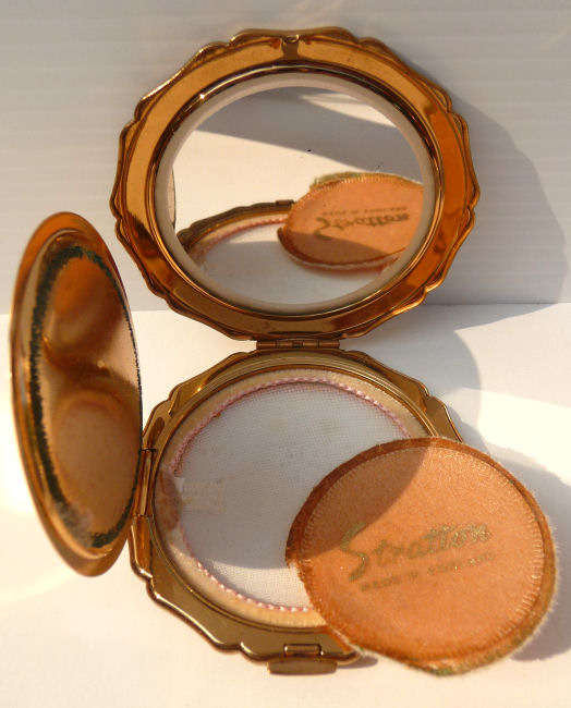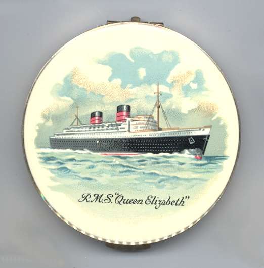 This is a double collectible compact featuring the Queen Elizabeth steamship crossing the Atlantic. Her double smoke stacks are clearly visible. Made by Stratton, this is one of their earlier designs. The compact was obviously much loved by its former owner as it does show wear. There are a few very minute chips on the front that really aren't noticeable unless you really look for them. The back of the compact is gold tone with concentric rings. Inside features a mirror in the lid in perfect condition and covered powder well in base (some scuffing on cover). All in all, a very desirable collectible for both steamship and compact collectors. Measures almost 3" diameter. (Click on pic for more photos.) |