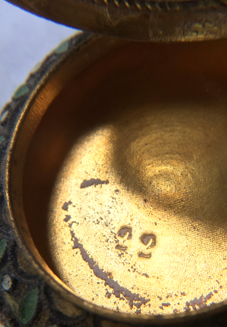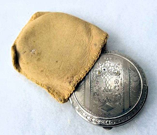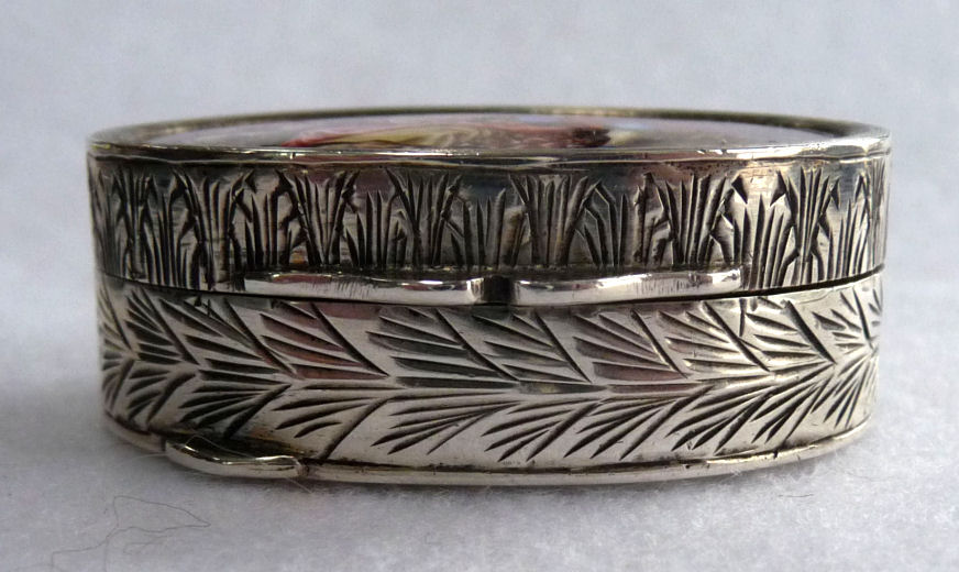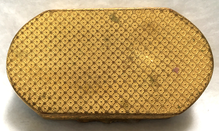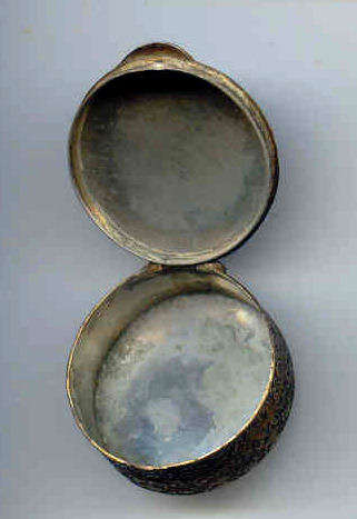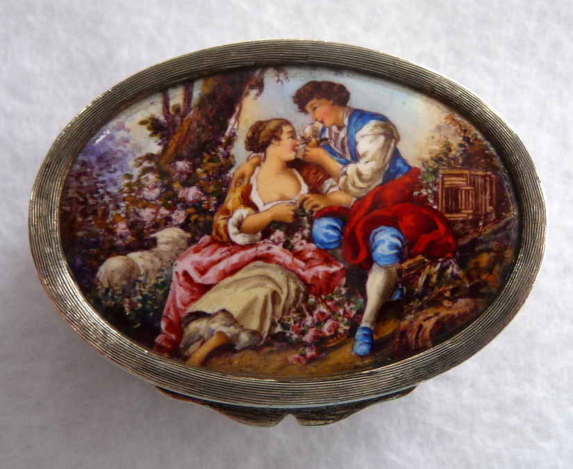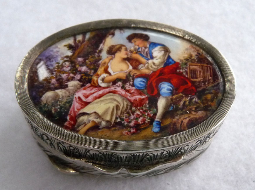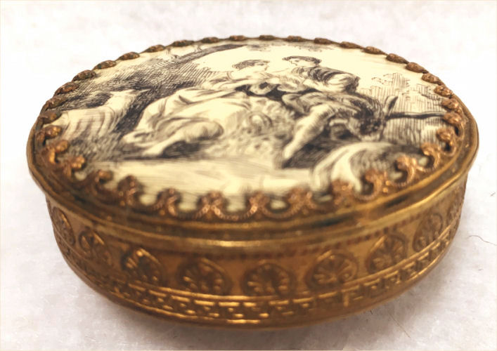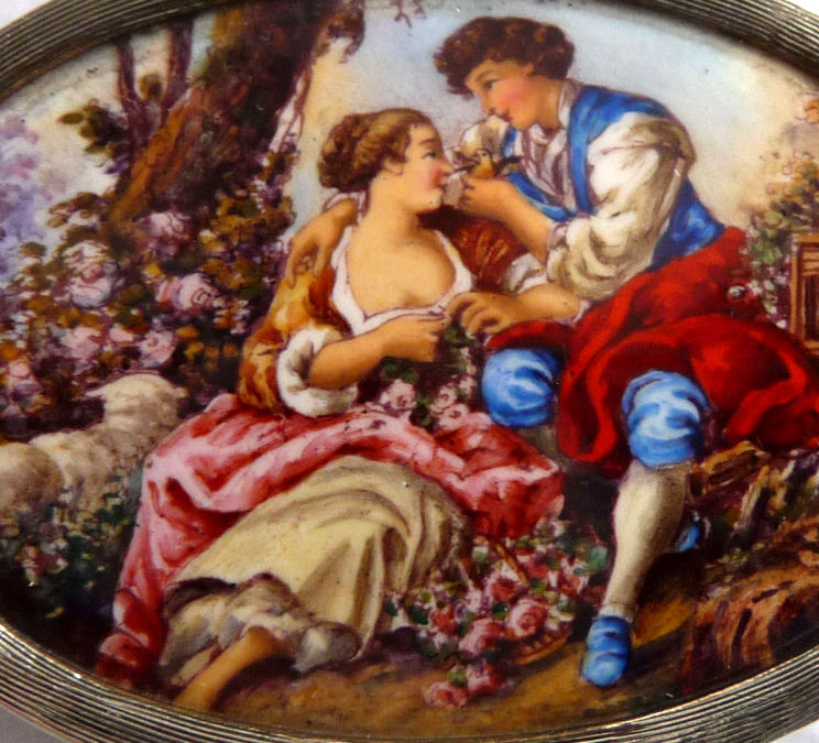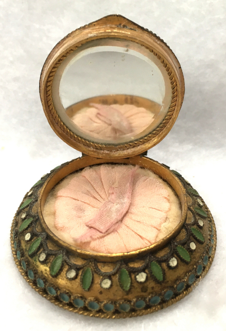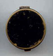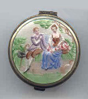 This very tiny (only 1-1/4" diameter) patch box features a courting couple done in hand-painted enameling on the lid. The case is covered in black enamel that is chipping significantly on both the sides and the bottom (could be completely removed down to the brass base if this is bothersome ... personally I like the character it gives). The design on the lid is not completely flat ... it has a slight domed shape and there is some relief as the lady's knees are raised up a bit for depth. Interior is basically empty ... no mirror and no puff which leads me to believe this was a patch box. (Click on pic for more photos.) |