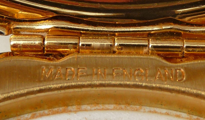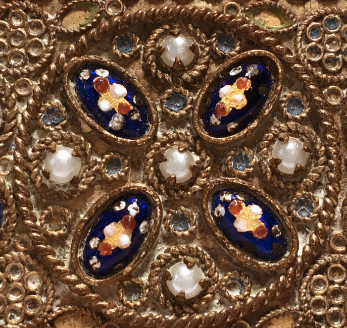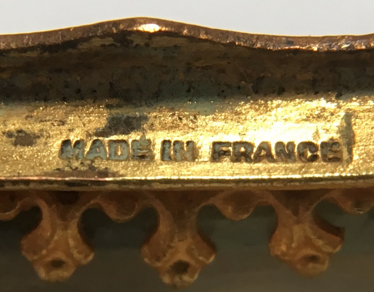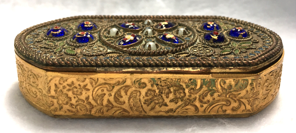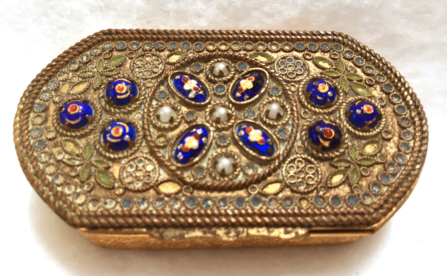 This beautiful compact was Made in France and has an elongated shape with lots of detail on the lid. There are 5 pront-set pearls in the center with enameled cobalt glass "jewels" in cobalt with gold and red florals. The center ones even have tiny drops of white enamel to replicate the larger pearls. There are also enameled leaves and blue flowers scattered across the surface. It is quite an intricate piece! When you open the compact, the inside features a nicely beveled mirror in the lid with a very ornate fleur-de-lis gold bezell ... there is some clouding to the mirror but it is still functional just a bit faded looking. The bottom of the compact features two compartments, one each for powder and rouge, and both with a detailed ornate lid which opens on a hinge. It is signed "Made in France" on the top rim under the clasp. It is a truly beautiful piece! Condition is excellent throughout ... base has a tiny dent but is inside the covered compartment so doesn't show from the inside. Measures 2-7/8" long 1-5/8" wide x about 5/8" deep. (Click on pic for more photos.) |