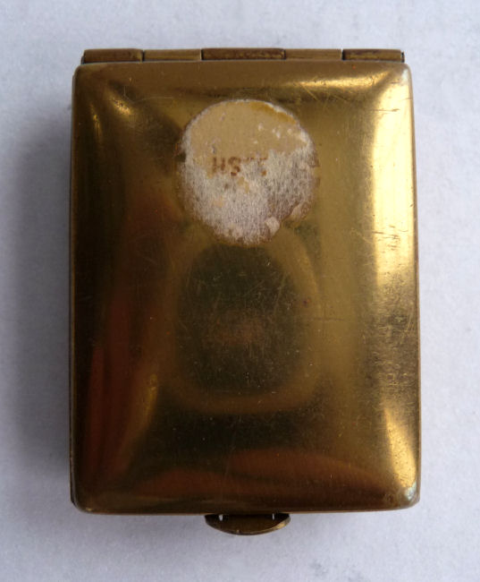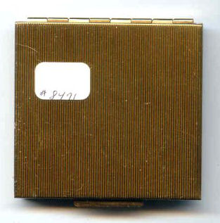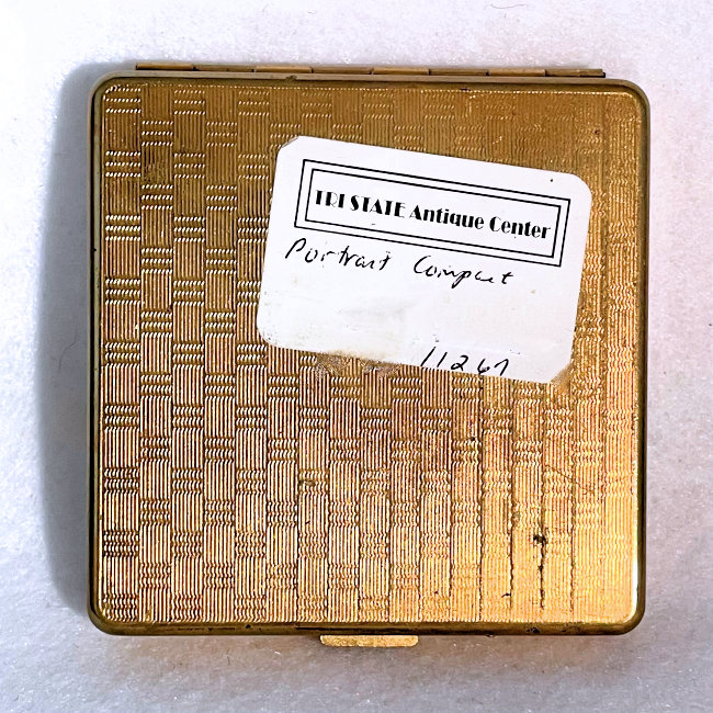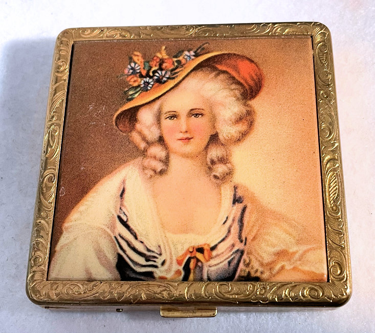 What a pretty lady she is! Dressed in her Sunday best, this lovely woman's portrait makes up the entire front of this compact. It is done on some type of celluloid or plastic material set into an embossed brass frame. The interior has a beveled mirror in the lid which has some minor silver loss and "dust" and the original powder screen and puff with traces of loose powder in the base. The bottom is engine turned. The only markings on this compact is the phrase "Made in USA" beneath the hinge, so I have no idea who the manufacturer was. It's a lovely compact for display or use. Measures 2-3/4" square. (Click on pic for more photos.) |