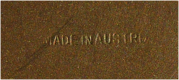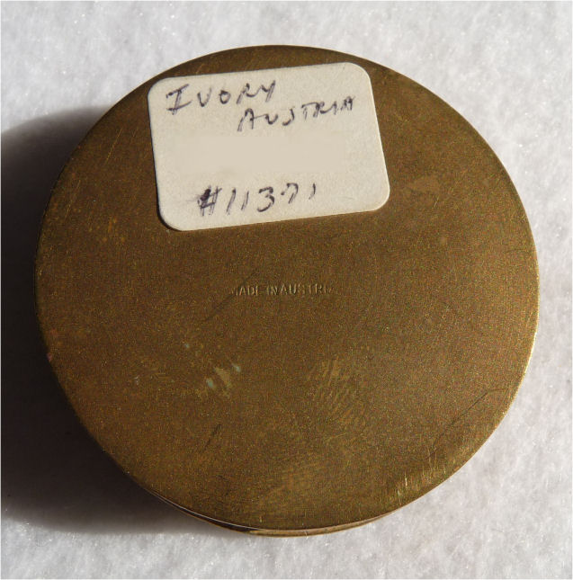 I have cherished this compact in my personal collection since 2003 and have always loved the tranquil romantic scene which is a variant of Francois Boucher's "Lover's Tryst" (also known as "The Four Seasons: Spring") done in 1755. When I purchased it, I was told it was done on ivory but I cannot tell the difference between ivory and bone, so it could be one or the other. Either way, the detail is exquisitely done and clearly shows both lovers with a sheep of to the side in a pastoral setting. The scene covers the entire lid and is wrapped in beautifully detailed bronze prongs whch hold it tightly in place. The sides of the case are richly embossed with Greek designs. Inside the case is a full size mirror with a tiny beveled edge. The bottom half has a rotating powder sifter. The lid is slightly domed and is quite heavy for its size as bronze will be. It is marked "Made in Austria" on the bottom. It is a truly exquisite piece measuring almost 2" diameter x 5/8" deep. (Click on pic for more photos.) |