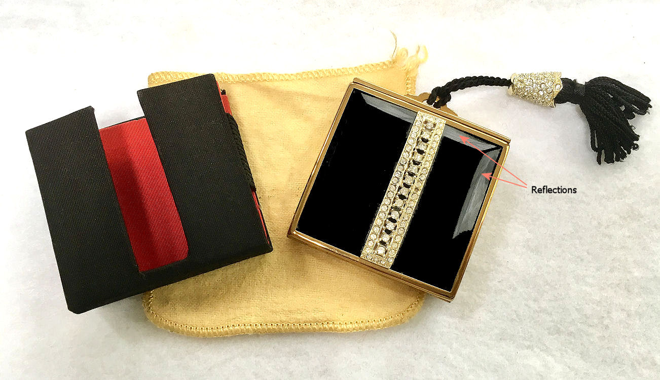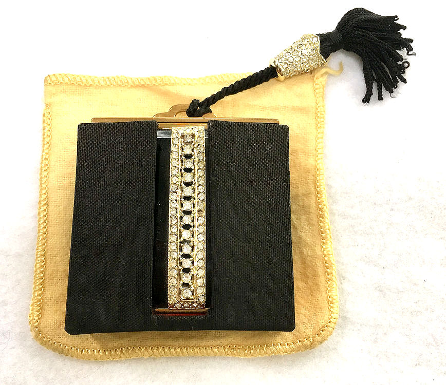 This is a very unique and rare compact made by Kotler & Kopit. It is done in jet black enamel with rhinestone jewels in the center and on the matching tassel cap which sparkle like diamonds. The compact fits inside a case specially designed to allow the jeweled band to show through while protecting the enamel finish. It is such an elegant design! The inside features a beveled mirror in the lid and a covered powder well in the base with original screen and its original puff bearing the insignia for Kotler & Kopit which is the K & K initials with a reclining nude silhouette. The compact bears the patent number for the year 1931. Back of the compact case is gold. The interior of the case is lined in red to accent the compact and there is a felt sleeve to protect that as well. Jewels are all intact and entire case is in mint condition. It is a truly beautiful piece and is extremely well made. The craftsmanship is extraordinary! Compact measures approximately 2-1/4" square. (Click on pic for more photos.) |