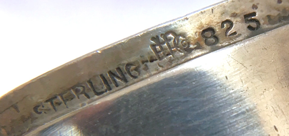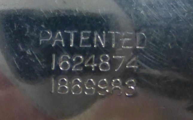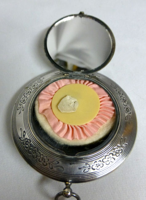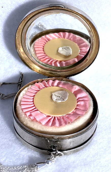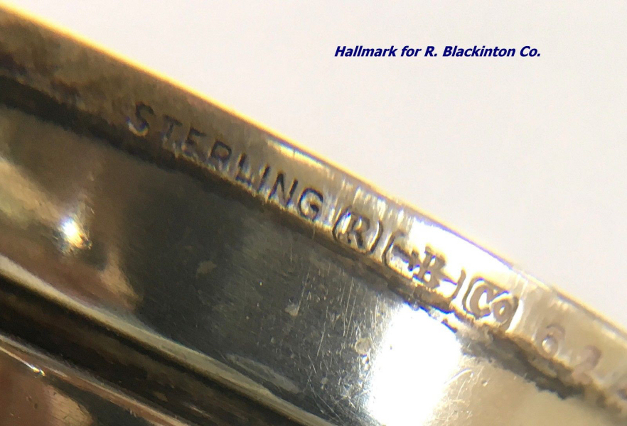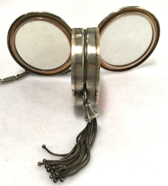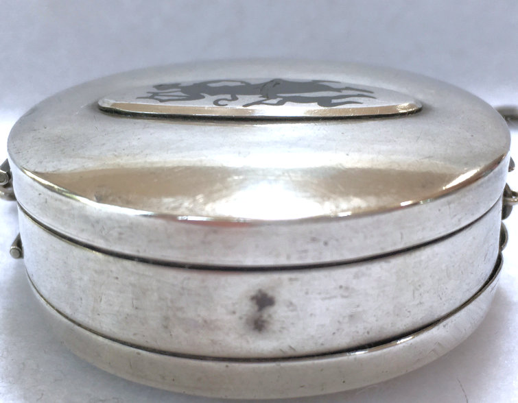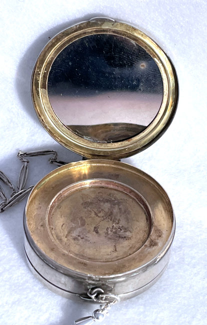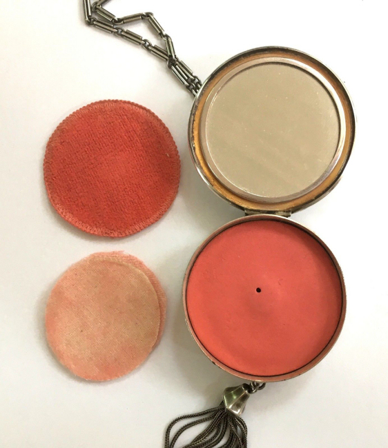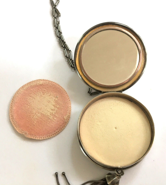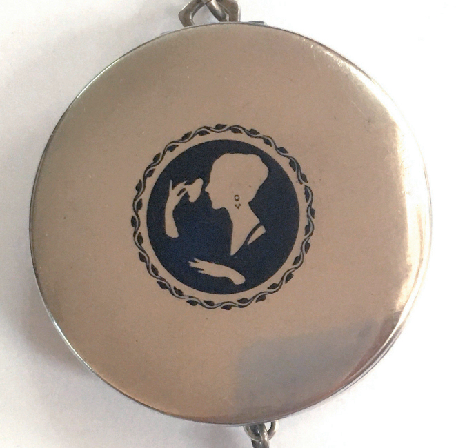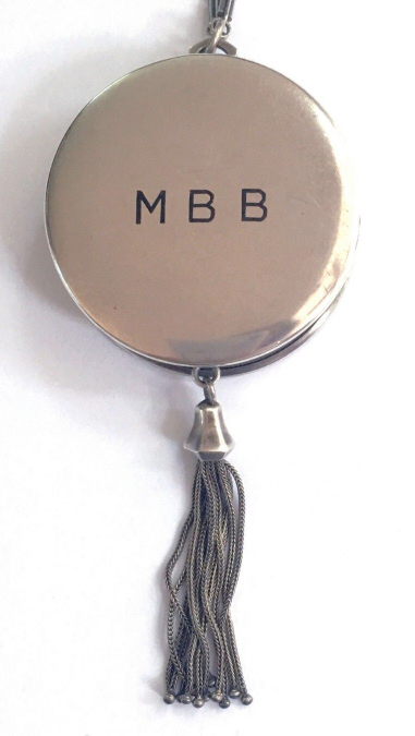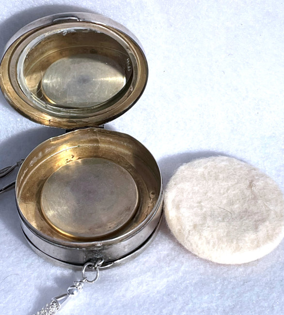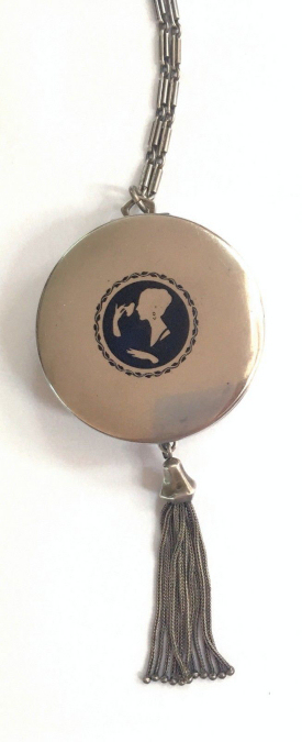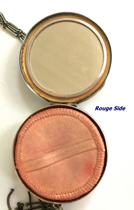 R. Blackinton Co. was founded in 1862 in N. Attleboro, Massachusetts, and became synonymous with fine silversmithing through the 1900's. Amongst their many items, they also created a line of lady's vanity pieces and this is a fine example of one of those. This compact is a very rare design in that it has TWO sides that open independently and each side has its own mirror, one for rouge and one for powder, as well as a carrying chain and pretty little tassel to finish it off. The front of the case has a deco silhouette in black of a lady powdering her nose ... very sweet! The back side of the case has the initials "MBB". Upon opening the top side of the compact, you will find a full size mirror in the lid and a powder pad with original puff which does not appear used at all. The powder residue on the puff is just from resting on the powder. Upon opening the back side of the compact, you will find another full size mirror and a rouge pot with original puff, again which does not appear used at all. There were tiny rounds in between the puff in the rouge pot, one probably to keep each puff clean from the powders. But since they were both in the rouge side, the powder puff did get some powder on it. I have moved it now to the powder side so both are protected. The overall condition of the compact is excellent with no damage of note. It is a beautiful piece! The compact itself measures almost 2" diameter x 5/8" thick. The chainlink handle has a 6" drop and the tassel is 2-1/4" long. (Click on pic for more photos.) |