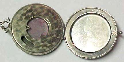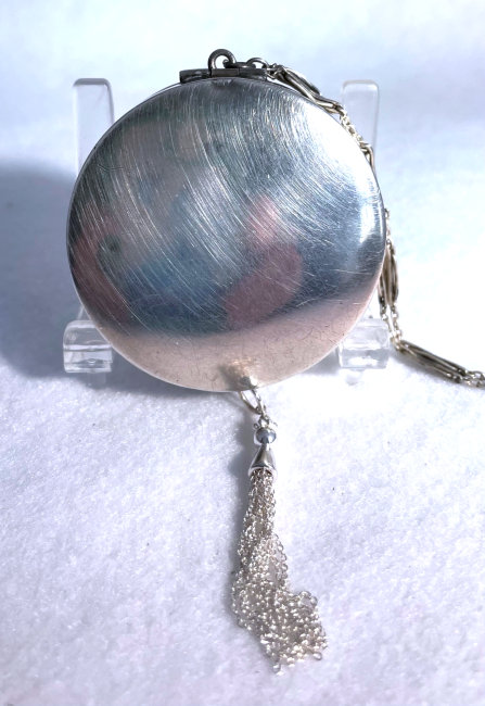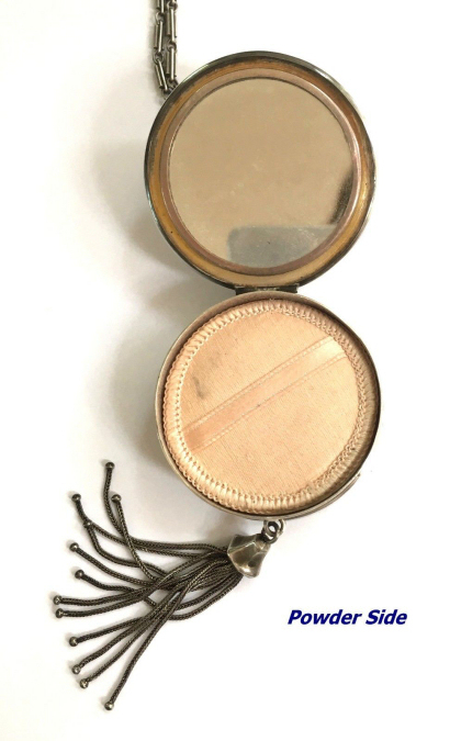 Here is a lovely Art Deco influence sterling silver double compact made by James E. Blake Company of Attleboro, Massachusetts, who were in business from 1889 - 1936. There is a silhouette of two deco nymphs on the front of the case suspended from a chain. The compact itself opens from both front and back. Each half has a mirror in the outer portion and the center section is designed to hold a rouge pot on one side and a powder pat on the other. There is an original brand new unused lambswool puff inside with pink ruffled ribbon and celluloid trim ... very pretty! There are a few dents in the case as are visible in pics. There is also a scratch across the nymphs which has been blacked in but is visible when held to light (not when just looking at it straight on). The original tassel was missing from the bottom but I was able to procure one that looks pretty close to what would originally have been with this. Compact portion measures almost 2" diameter x almost 3/4" deep. (Click on pic for more photos.) |