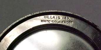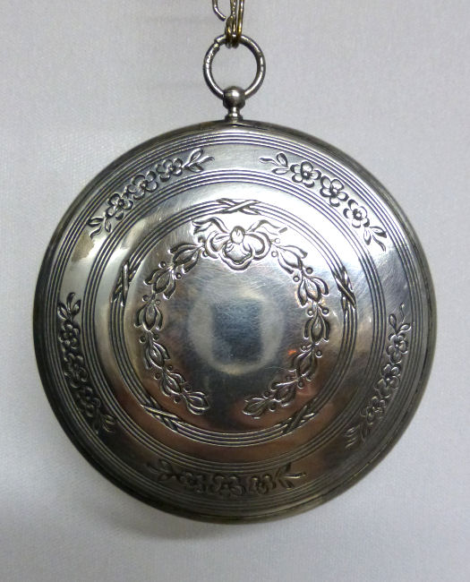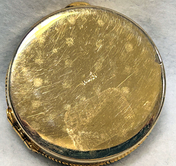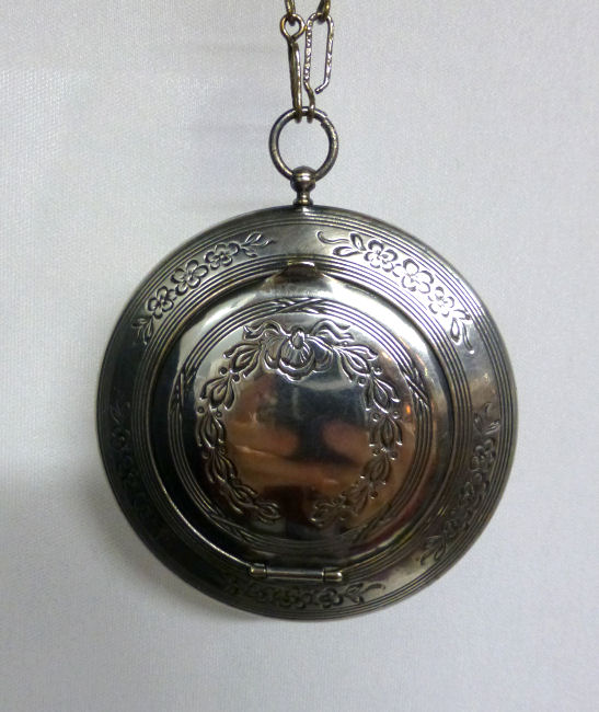 Here we have a stunning little compact done in acid etched designs on a solid 14K white gold front case. In the center of the lid is a raised cartouche with enamel guilloche white background and hand-painted rose. Edge of case is deeply embossed and back has deeply etched designs as well. Interior is just as stunning as the outside ... there is a framed-in mirror on one side and the tiniest little rouge pot on the other with a rotating powder sifter around it (no rouge). It comes with the orginal finger ring chain as well. Marked R & G and Belais 14K White Gold Front. Very Victorian looking. Measures a mere 1-7/8" diameter. (Click on pic for more photos.) |