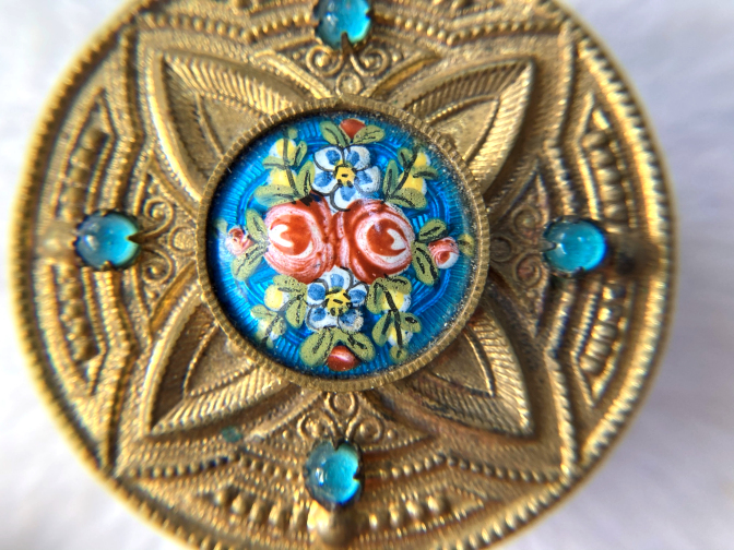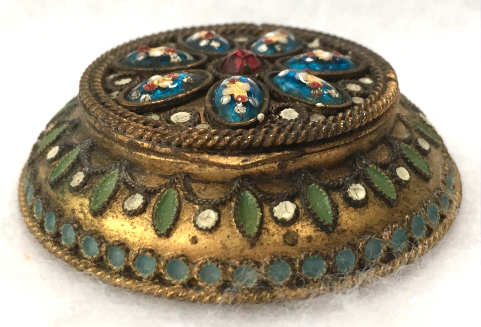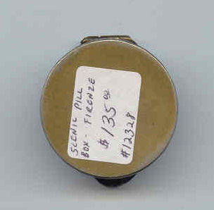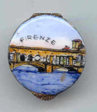 This is a wonderful little pill or patch box in antique brass with a hand-painted enameled scene on the lid depicting Florence (Firenze), Italy. Sides of the box are ornately embossed with leaves, urns and scrolls (I will try to get a photo of this soon). Lid is hinged on and snaps shut tightly ... has a little tab to lift it open. Excellent condition overall with great patina. Measures 1-1/4" diameter x 5/8" deep. (Click on pic for more photos.) |