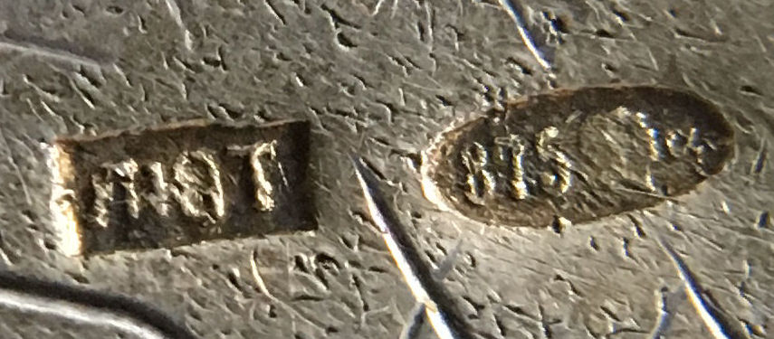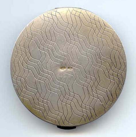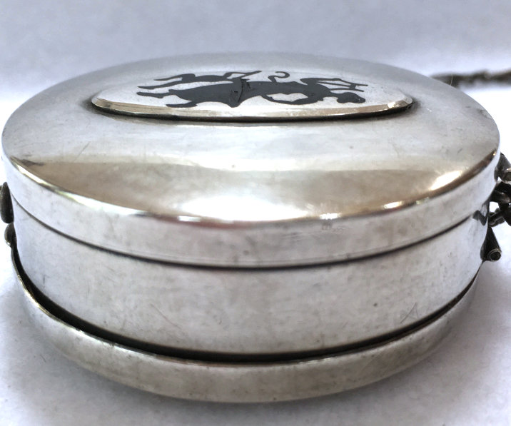 Thanks to a kind person, I was able to learn that the statue depicted on this compact is located in St. Petersburg in Russia. It is a statue of Tsar Peter the Great who founded the city and tried to modernize Russia in the 18th Century. The statue was erected by Catherine the Great. The front of the compact features a richly embossed horse and rider with the words "Petro Primo/Catharina Cecundo" and the date MDCCLXXXII which is 1782. There are silver hallmarks on the back. Case measures 2-1/2" diameter and is in excellent condition. There is a powder screen and a swans down puff inside. (Click on pic for more photos.) |