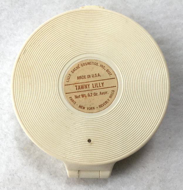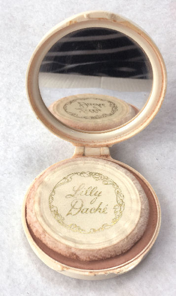 This lovely compact by Lilly Daché is done in faux ivory (ivorene) and features a deep relief rendition of Pierre-Auguste Cot's 1873 painting entitled "Springtime". This compact is from Lilly Daché's "Loving Touch" line and is one of the finest and most desirable compacts from them. The designer's initials can be found above the figures just below the hinge. Inside the compact has a full mirror in the lid, original signed powder puff, and powder in the base. It has been gently used but there is still a lot of powder remaining. The bottom of the compact has the original label as well. Measuring 2-3/4" diameter x 3/4" deep, it is in excellent condition with no damage or cracks to the compact. (Click on pic for more photos.) |