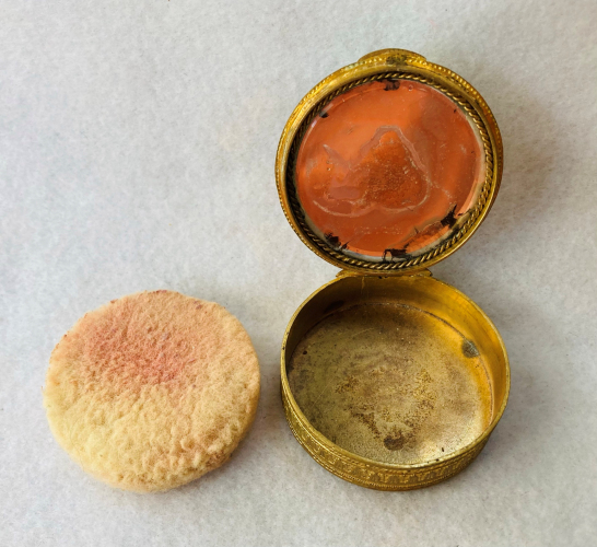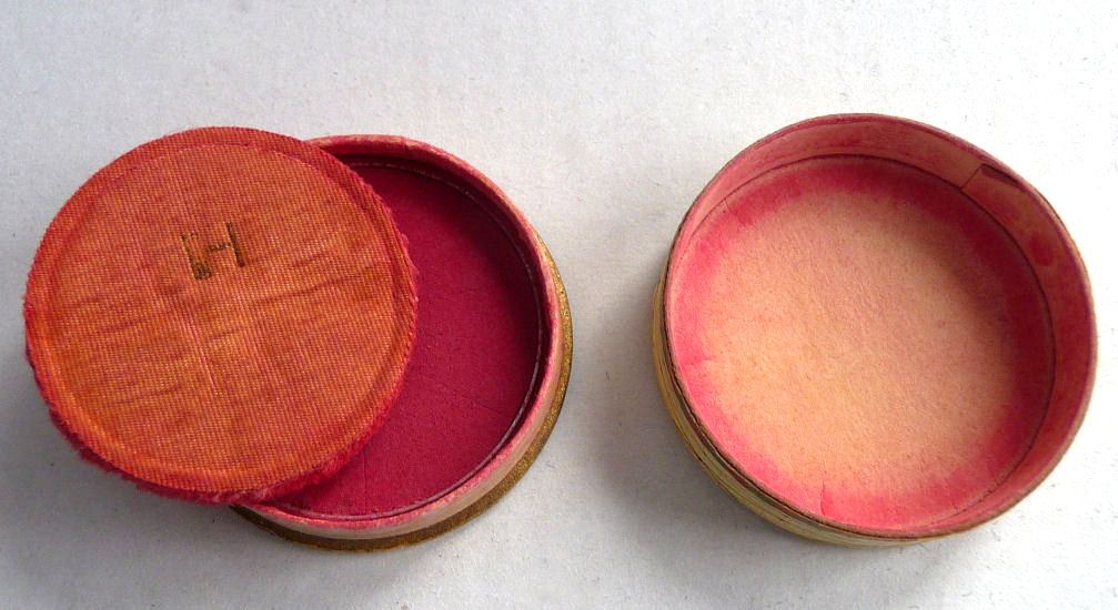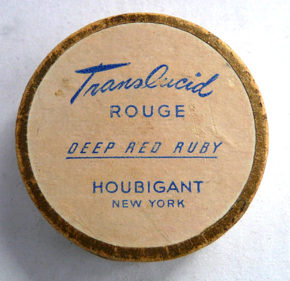 This is an adorable little rouge box by Houbigant with their signature beribboned flower basket on the lid. Made of paper covered cardboard, these fragile boxes are all but gone nowadays and very hard to find in this condition. While the box shows some minor age-appropriate wear, the interior still contains almost all of the rouge and the original puff with the H visible on it. On the botom it reads" Translucid Rouge Deep Red Ruby Houbigant New York". Measures 1-5/8" diameter x 1/2" high. (Click on pic for more photos.) |