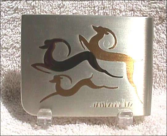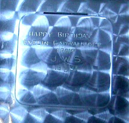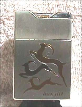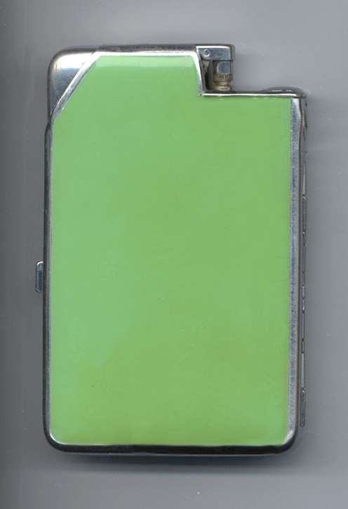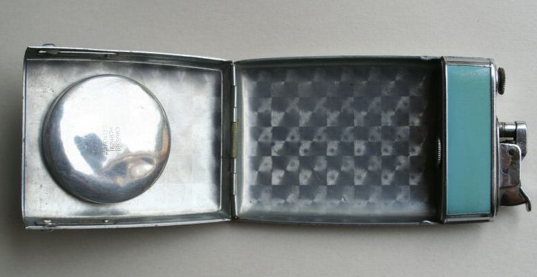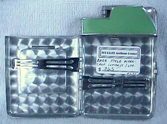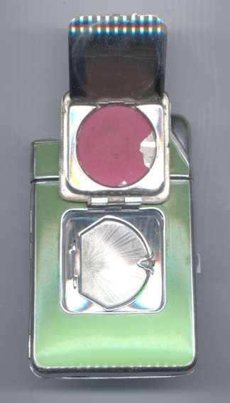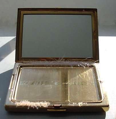 Try as I might, I could not even come close to capturing the color of this wonderful Elgin American gift set. This was new-old-stock (meaning it's never been used) ... the set includes original store display boxes and sleeves for the pieces. Each piece is embossed with three deco gazelles in shades of gold on a brushed silver background. Both items are MINT condition! Compact approximately 3" x 2-1/4" and has original paper advertisement inside. Matching lighter is 1-1/4" x 2-1/8". Be sure to look at all the pictures of this superb set! (Click on pic for more photos.) |