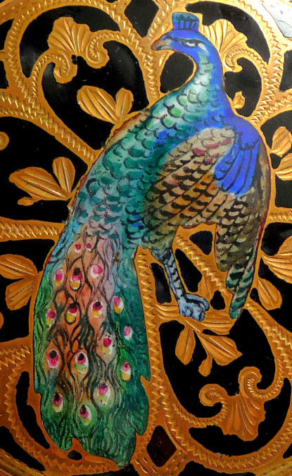 This is a really lovely compact featuring a full-bodied peacock on the front done in beautiful jewel tones in enamel champlevé. The background is done in gold tone metal with black champlevé and the back of the compact is the same only without the peacock. The compact has a full mirror inside the lid which is in very good condition with only the most minute silver loss at the very edges. Marked "Austria" in the base. Included is a new maribou puff. Condition is absolutely fantastic with no chips or damage to the enamel whatsoever. It is a large compact measuring approximately 3-1/4" diameter. (Click on pic for more photos.) |
