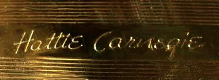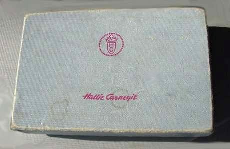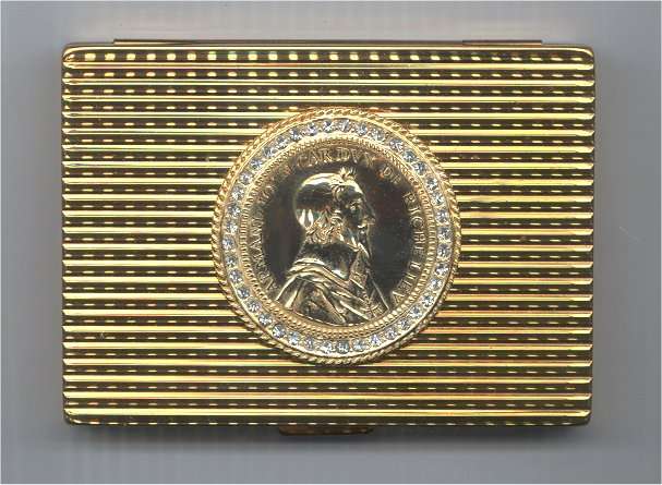 This wonderful gold tone compact by 20th century designer Hattie Carnegie features a vignette of Armand Joan, Card. VX de Richeliev, a famous(?) French cardinal and statesman (at least that's the story that I was told when I purchased this some time ago). Surrounding the vignette is a circle of faux diamonds ... I tried to count them and I think there are 40 ... difficult to see them and count with my old eyes! In any case, I did ascertain that they are all there and none are missing. The gold case made it very difficult to scan with good color ... the lid design is grooved ridges that run left to right ... back is done in a very fine similar pattern but the grooves are not as defined. Interior has a covered powder well with the signature of Hattie Carnegie across the cover; beneath this is the original lovely peach swansdown powder puff and the original powder screen. A perfect mirror is in the lid. The compact has been kept in its original signed Hattie Carnegie box since it was purchased ... it has never been used and is in mint condition! Measures 3-1/4" x 2-1/4" x 3/8" thick. (Click on pic for more photos.) |