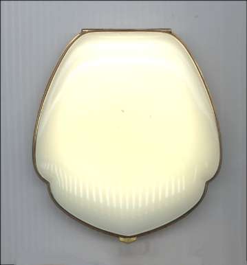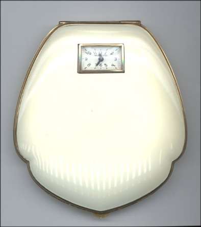 Here is a fabulous piece of jewelry as well as a functional compact for milady fair. Made by Illinois Watch Co. -- known for their fine quality watches -- this MINT condition piece features a working watch in the ivory-enameled lid. Shaped like a clamshell, the interior is all goldtone with a half-circle mirror in the lid. Base has covered rouge pot, covered powder well, and the clock compartment. Retains original unused puff and protective felt sleeve with the Illinois Watch Case Co. name on it. This is just an extraordinary piece! Back is finished in ivory enamel as well. Measures approximately 3-1/4" wide x 3-1/2" high. (Click on pic for more photos.) |
