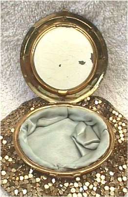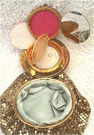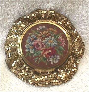 This is the first and only one of this kind I have ever owned ... and it is in near mint condition. The petitpoint stitches are extremely tiny and are done in soft colors of pinks, blues, and greens with some gold on a mauve background. The top is bordered in embossed designs with black enameled accents. I love the way these open up in four different directions ... first for the purse, then for the mirror, then the powder, and finally the mirror swings open for the rouge. This one has the original rouge puff and the rouge still has the Evans motif embossed in it. I don't believe it's ever been used .. the puff is only stained from being stored on top of the rouge. There are a few chips to the enamel covering the powder section; again, I think this has occurred simply from age rather than use as there is no sign of it ever being used. There is also a tiny white puff in the powder compartment. Bottom portion is lined in pale green satin and outside is finished in bright gold mesh. Compact top measures approximately 2-1/2" diameter; purse when lying flat measures 4" diameter. This one is a real beauty! (Click on pic for more photos.) |