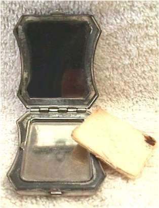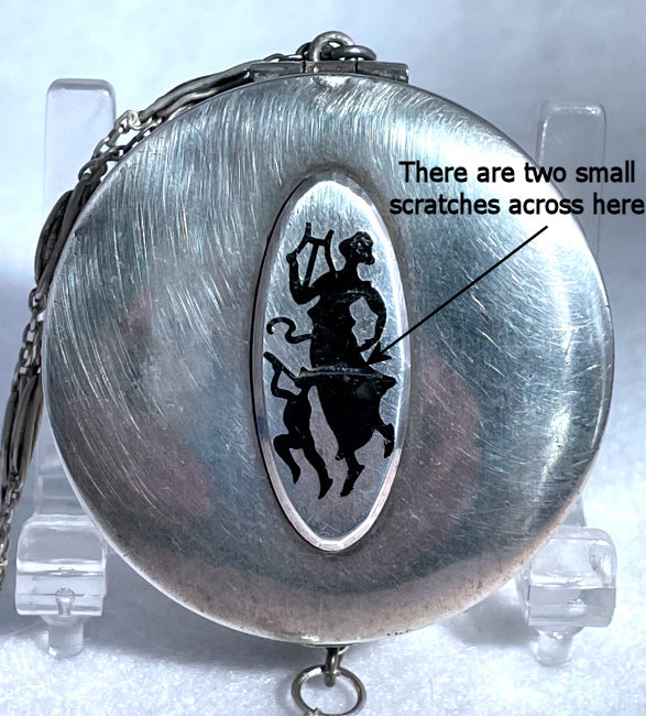 Scottie collectibles are so hot and compacts with scotties are even harder to find than the usual collectibles. This one came from an estate where it had been much loved as evidenced by the wear to the compact case and interior. I believe it was nickel over copper and the copper is showing through which give it a beautiful warm glow. The interior has oxidation to the edges and a bit of rust in the powder compartment under the powder lid. Original puff is still inside with a rust spot on it from the metal. Even with these problems, the compact is a darling collectible and displays beautifully. Has a suitcase hasp type closure. Back is engine turned with a small area for a monogram that is still empty. Measures approximately 1-1/2" wide x 2" high. (Click on pic for more photos.) |