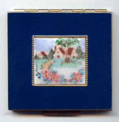 This is a very unusual compact done by Rex Fifth Avenue. They usually did not do scenics; however, this one has a darling cottage scene that appears to be hand-painted in enamel guilloche on the front surrounded by a dark blue cover. The scenic portion is slightly domed like a pillow to give it a raised effect. The interior has a full mirror in lid and covered powder well in base. The original Rex Fifth Avenue puff is still inside in perfect condition and powder well is still full of loose powder. Overall condition is remarkably good. Measures 2-5/8" wide x 2-1/2" high. (Click on pic for more photos.) |