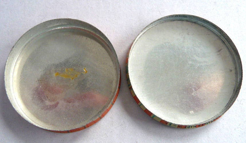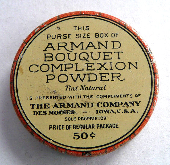 I just love this little tin powder box with the silhouette of an elegant lady on the lid. This purse-size box of complexion powder was a complimentary item probably included when a full-size powder was purchased. The price of this box alone would have sold for 50 cents in the 40's when this was made (be sure to see pics for the full description of this on the bottom). There is only very minor wear to the litho on the tin which the photos make look much worse than in person. To the naked eye it appears to be in excellent shape. The contents are no longer inside so it is just the tin being sold. Great collectible! Measures 1-5/8" diameter x 3/8" high. (Click on pic for more photos.) |