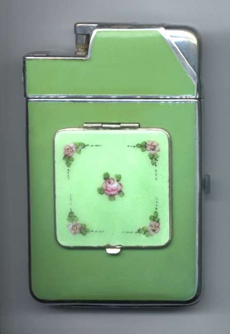 WOW! This spectacular Marathon combination compact/rouge/lighter/cig case is one of the only ones of its kind I have seen. Rare style and color make it a real treasure! Case is done in solid satin green enamel while the compact is a beautiful pale green enamel guilloche with hand-painted roses. The lid lifts to reveal not only a covered powder well but a bright metallic mirror that pops up to expose a rouge pot (with rouge still inside!). Interior of case is done in engine turned designs on silver base metal. There is an inscription etched into the back of the compact that reads "Happy Birthday Evelin Gadwallader from J.W.S 1934." Enamel is all in very good condition with no chips or flakes, only superficial scuffing from normal wear. Case does have a few very minor dents visible upon close inspection, but really not a factor in such a rare piece. Measures 2-1/2" wide x 4" high. (Click on pic for more photos.) |