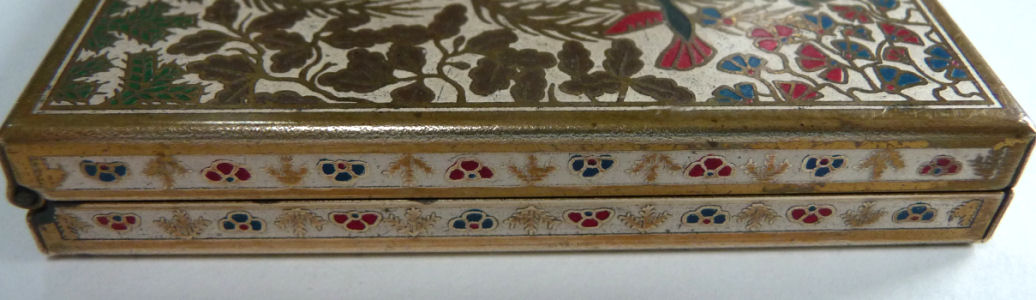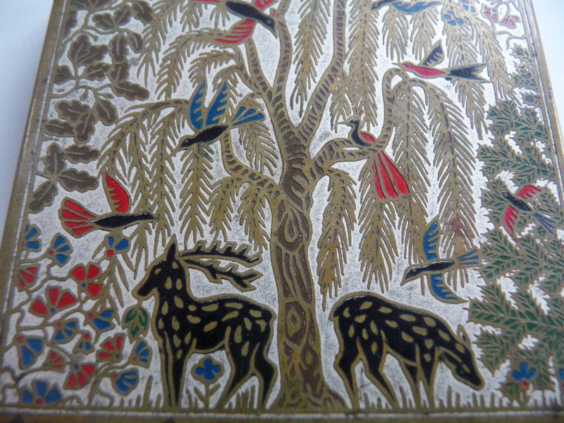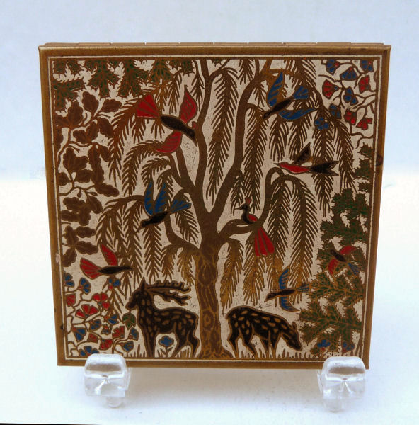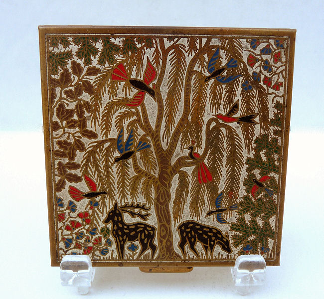 This wonderful compact by Volupté is exceedingly rare ... they make several variations of this style of compact mostly found with elephants and jungle scenes. This one features a forest scene with a stag and his doe beneath a weeping willow which is chock full of colorful exotic birds. Both the front and back are identically done in this beautiul cloissoné design. The four sides of the compact are also done in cloisonné flowers. The interior opens to reveal an original puff and covered powder well in the base and a full size mirror in the lid. The compact has been gently used and shows very minor wear ... pictures are super detailed and show any wear much worse than the eye will detect it, so rest assured the compact looks super in person. Measures 2-3/8" square. (Click on pic for more photos.) |