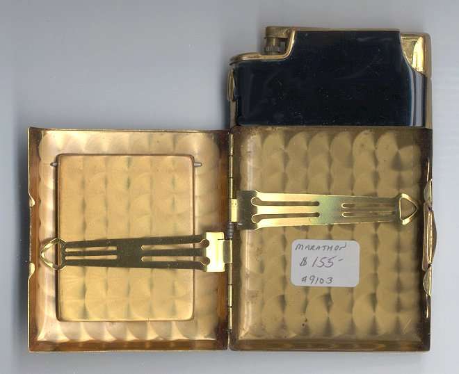 This outstanding combination compact/cigarette case/lighter was made by Marathon in the late 20's or early 30's. Features a compact on the front with green enamel guilloche background and hand-painted flowers. Very pretty! Inside is done in gold wash with clips to hold cigarettes. Interior of compact portion features a mirror in the lid and original Marathon signature powder puff and screen in excellent condition. All enameling is in great shape with no visible chips and only very, very minor baby fine scuffs appropriate for age. All in all a 9 out of 10! As these compact combos go, black is a very rare color to find.; cream and green are much more common. Measures 2-1/2" x 4-1/4" overall. (Click on pic for more photos.) |