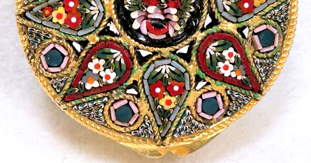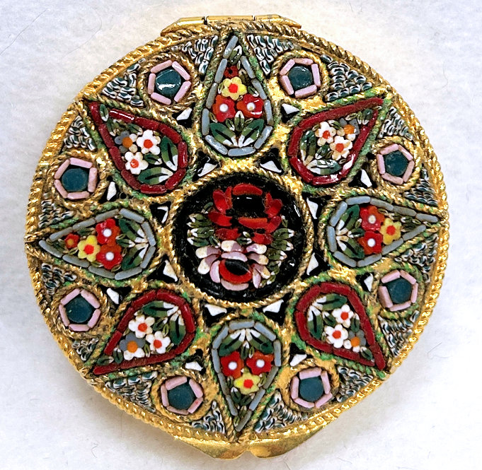 This is a beautiful round Italian micro-mosaic powder compact featuring an intricate floral design composed of hundreds of tiny glass tesserae set into a gilt metal frame. The top displays a radial arrangement of colorful flowers and foliage in shades of red, white, yellow, green, pink and blue, all meticulously hand-placed to form a symmetrical pattern around a central floral vignette. The mosaic is framed by a rope-twist gilt border. Inside is a full-sized mirror in the lid and a powder puff in the base. It is marked ITALY on the bottom. Lid snaps closed tightly. Measures 1-7/8" diameter x 5/8" high.. (Click on pic for more photos.) |