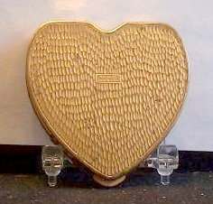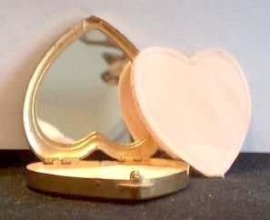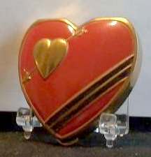 This is a very attractive and stunning cherry red heart shaped compact with a gold heart raised up on the upper left corner. Diagonal black enameled stripes set off the lower right portion. Although outside of compact does show some age wear (one tiny dent in center of front barely visible), the compact has never been used. Interior has mirror in lid and original powder screen and puff in base in mint condition. Marked "Hingeco" and "Made in USA" on back. Measures 2-5/8" overall. (Click on pic for more photos.) |