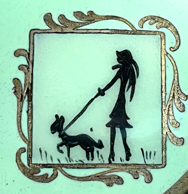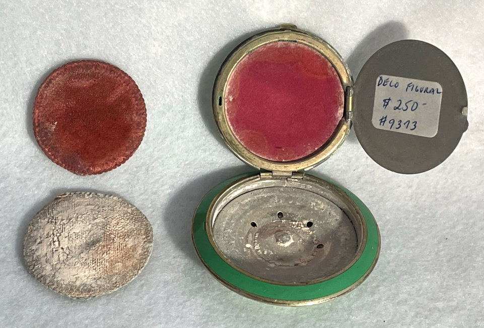 Here is a very cute little art deco figural compact featuring a lady in high heels! walking her dog. It is done on a pale green lid surrounded by a darker green case. The back has the same colors but minus the figural. At a glance it presents quite nicely but if you look closely, you can see tiny myriad scratches on both top and bottom from use. Price is based on condition. Inside is a metallic mirror in the lid which houses a rouge pot beneath with rouge still inside as well as a puff which may or may not be original. There is a powder sifter in the base with another puff that may or may not be original. Loose powder still remains as well. Lid snaps shut tightly and overall this is a great piece for display or use. Measures almost 2-1/4" diameter. (Click on pic for more photos.) |