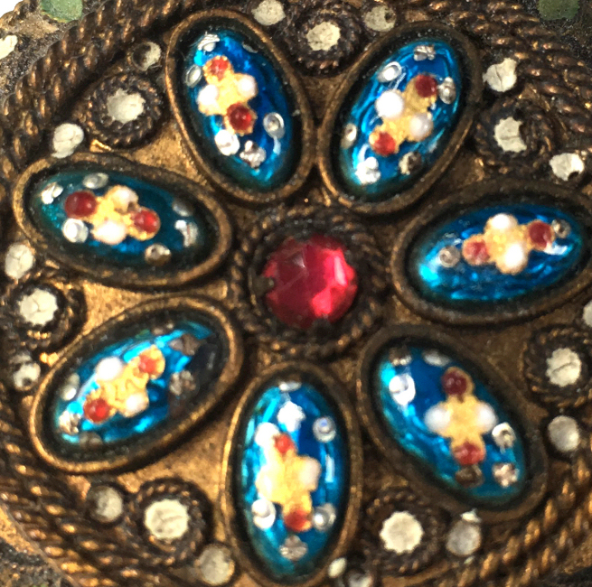 Here is another lovely French ormolu compact with a red jewel in the center surrounded by 7 turquoise glass bezel-set "jewels" with enameled flowers inside. I am not sure if these are a type of Venetian glass or not but they resemble the fine workmanship of the Venetian glass makers. Each of these has droplets of white enamel on the surfaces resembling pearls. The entire top and the beveled shaped sides are intricately enameled in white and green and blue to add to the beauty of this piece. Inside the compact is a beveled mirror in the lid ... the mirror is in excellent condition. What is really sweet about this piece is the original little lambswool puff with pink ribbon trim. I love those! It is marked "Made in France" on the inner rim beneath the clasp. There is also another mark inside the base but I cannot find out what that is. It is a truly beautiful piece! Measures almost 1-3/4" diameter x 1/2" deep (counting center jewel height). (Click on pic for more photos.) |