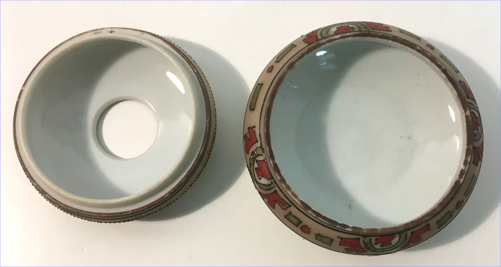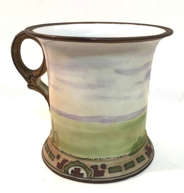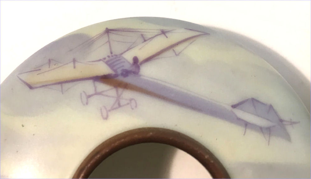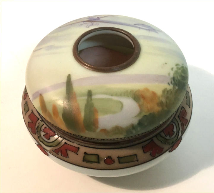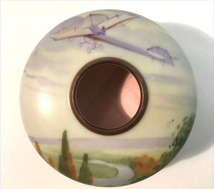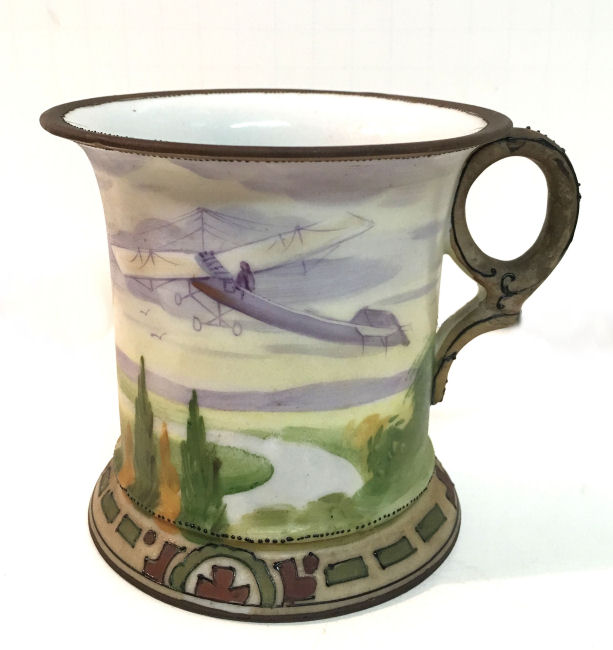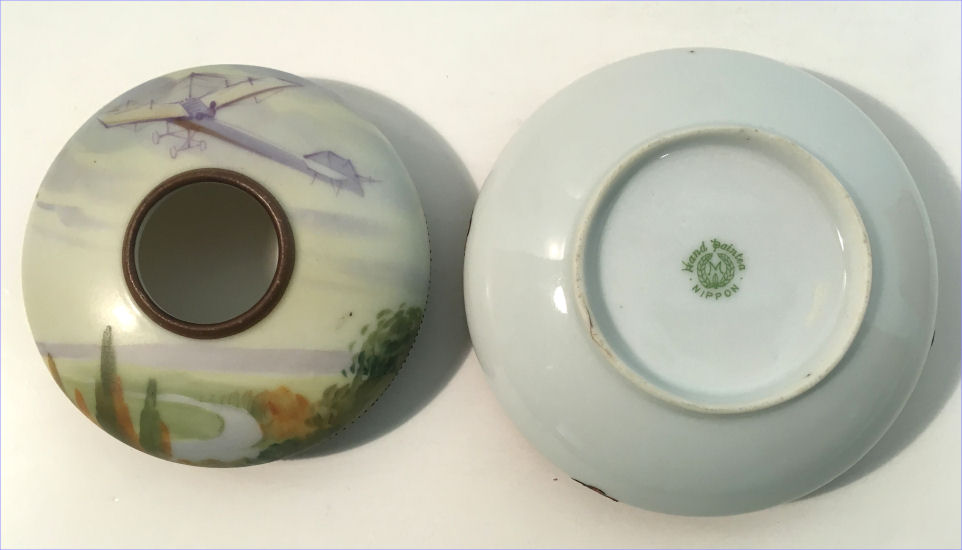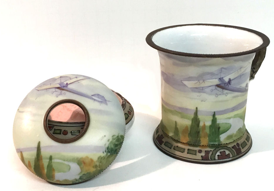 This beautiful matching His & Hers vanity set consists of a hair receiver and shaving mug. Both pieces feature a pilot in an early airplane flying over a tranquil winding river in a treed landscape ... so pretty! The planes and the clouds have lots of lavender and purple shades and the trees are green and gold. There is an almost Egyptian design around the base ... since King Tut's tomb was discovered the next year, I am wondering if the excavations going on in Egypt might have had some bearing on this. Both pieces are in excellent condition and both bear the Nippon mark which was used from 1891 - 1921. Hair Receiver measures 4" x 2-1/2" high; Shaving Mug measures 3-7/8" diameter at top x 3-5/8" tall. (Click on pic for more photos.) |