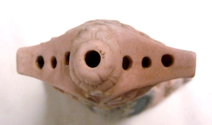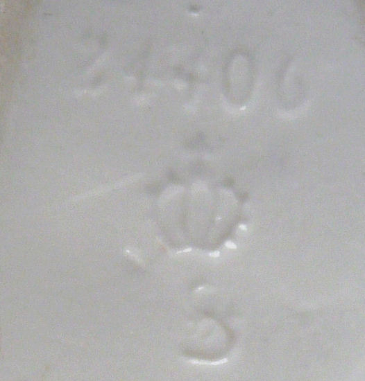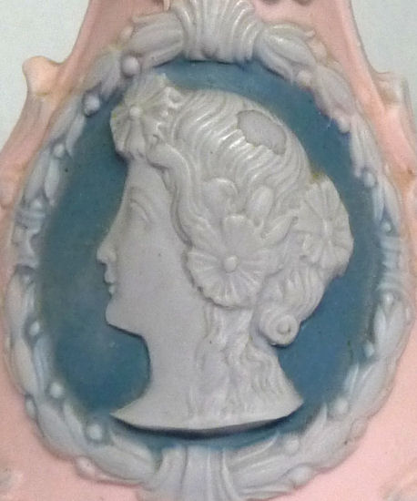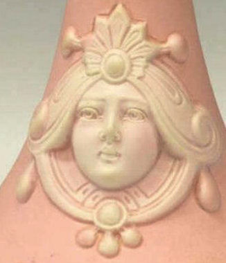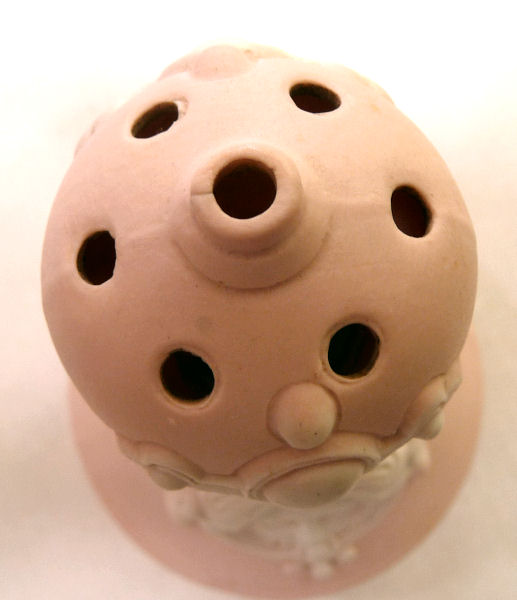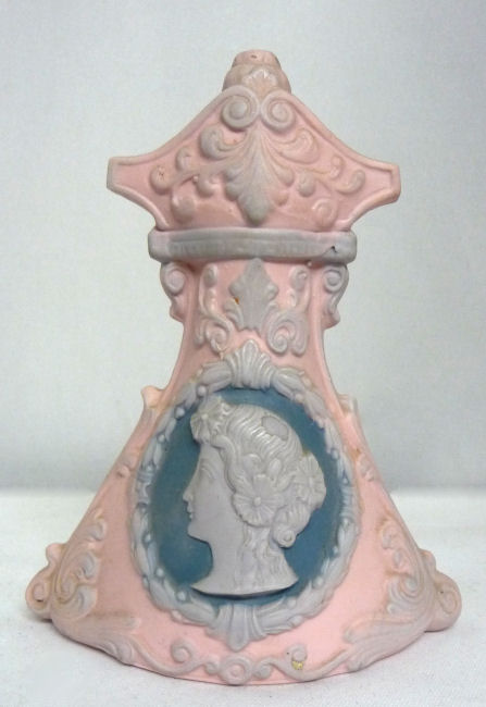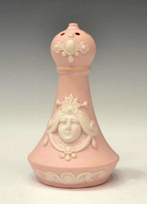 This is a lovely hatpin holder made in Germany by Schafer & Vater circa 1900. The color is a soft pink with a regal looking woman (Minerva?) featured on both sides. The finish is a matte bisque in pink with soft white raised decoration ... the cheeks have a pale blush on them as well. The top of the piece has 7 holes for hatpins. Overall it is in excellent condition with no damage whatsoever. It is marked on the base with the impressed Schafer & Vater crown and star mark Measures 3-1/4" diameter at the widest part of base x 5-1/2" high. Read about Schafer & Vater here. (Click on pic for more photos.) |
