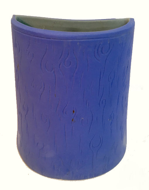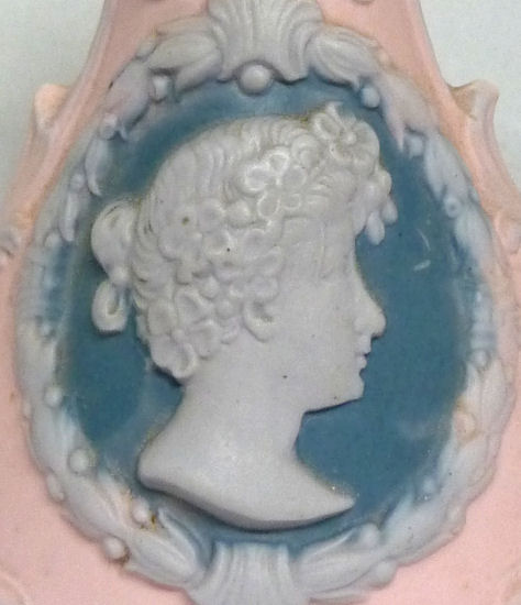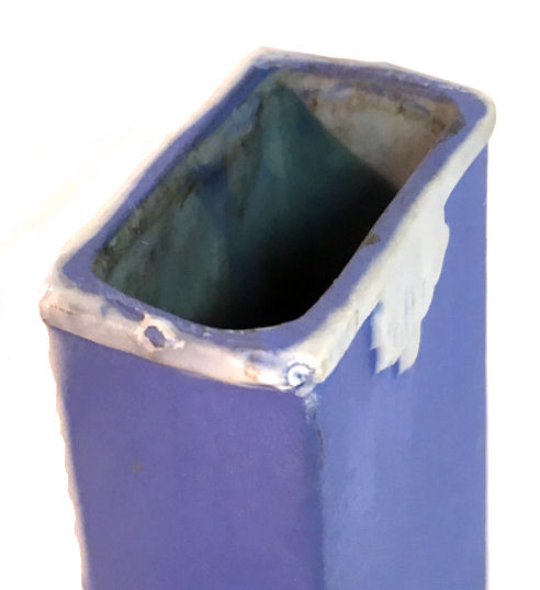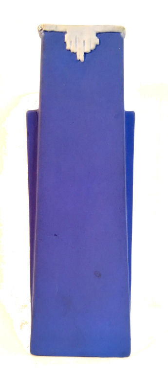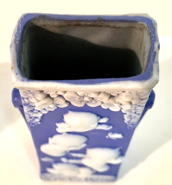 What a delightful scene this is! A fashionable woman in the most outrageous hat is totasting someone with her champagne glass. Made by Schafer & Vater, the beautiful deep Wedgwood blue color with high relief in white is truly gorgeous. This small vase could hold a few small flowers or short hatpins. Excellent condition with no damage whatsoever, itmeasures 3" x 1-5/8" x 3-1/4" high. (Click on pic for more photos.) |