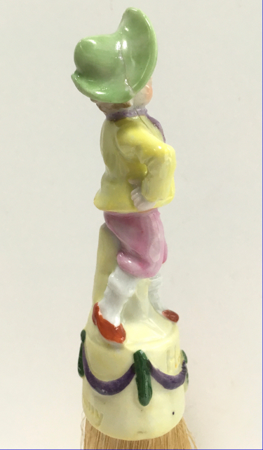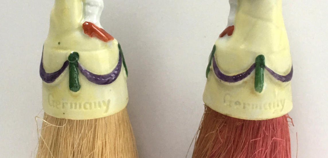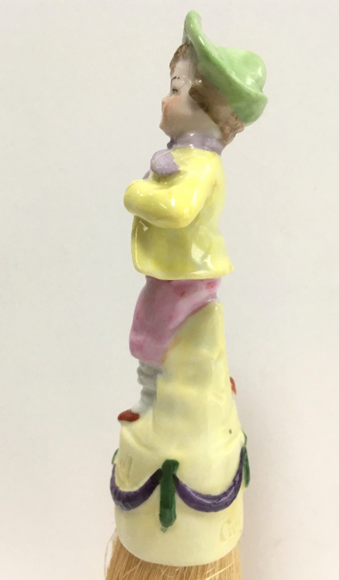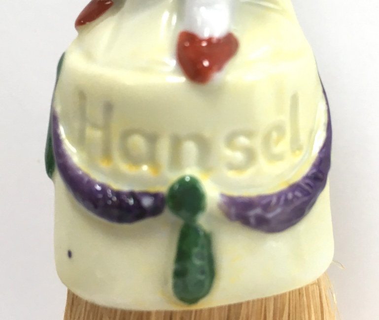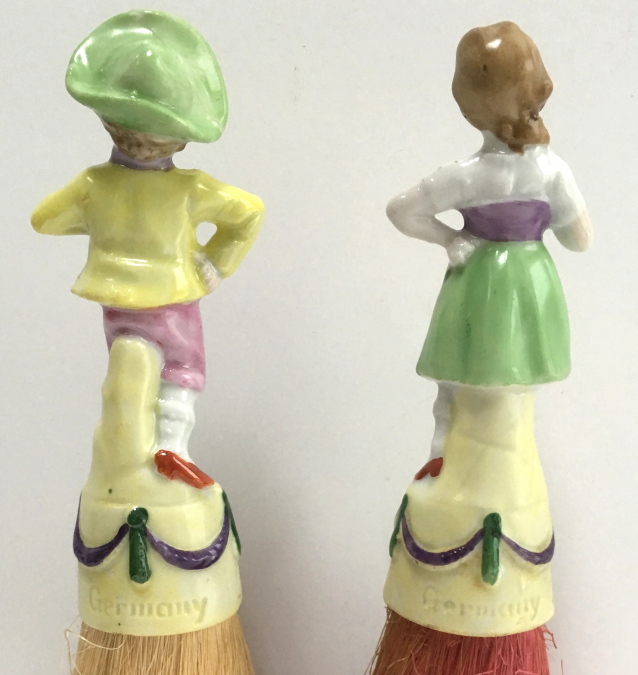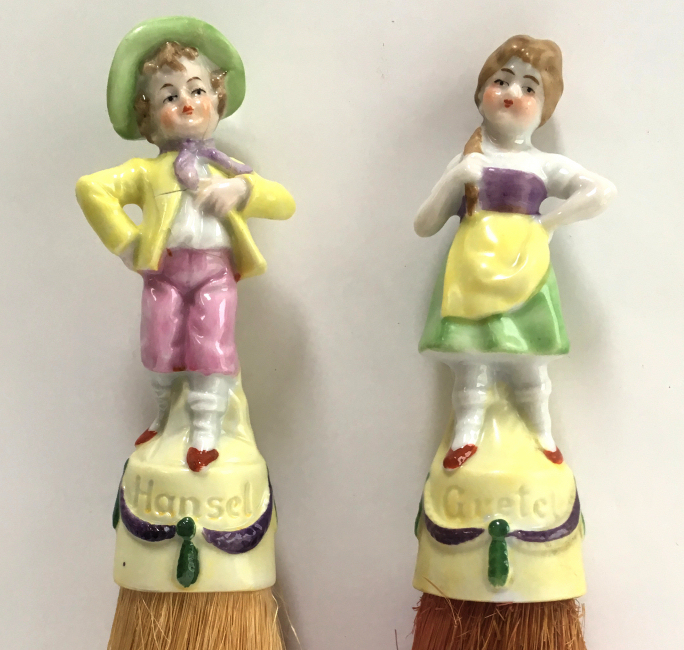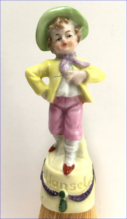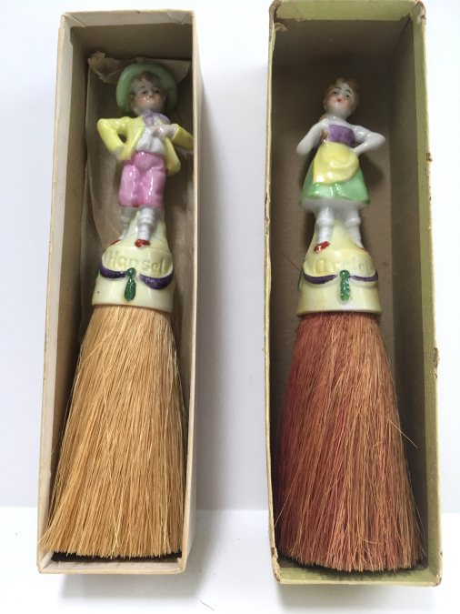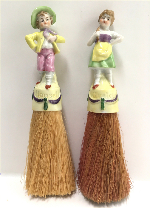 I have had this adorable set of half-doll porcelain clothes brushes in my collection since 2006. I have never before seen these in fairy tale characters before and in full figures as well -- not the half figures as it typically found in these. This set features Hansel and Gretel and have their original whisk brooms attached. When I bought them, there was only one box -- the one for Hansel -- and both were stored inside it with the lid fitting about 2/3 of the way on (see photos). As for condition, Gretel is perfect with no wear or damage whatsoever. Hansel, regrettably, has been broken and repaired years ago and not a great job. It could probably be redone better but I have left it alone. From some angles, it is not noticeable at all while from others, it is more obvious. When viewed from the front, it is pretty much indiscernable. I bought the set regardless of this because of its rarity. And I would rather have a repaired Hansel than have him missing altogether. They make a beautiful display! The brushes are also different colors. Gretel is pink (more faded on the front side than the back) which would be appropriate for the lady's brush. This could probably be removed and turned around if desired but again, I have left it as found. Both dolls are marked Germany on the lower backs. The doll portions measure 4-1/4" high; overall height is 8". Be sure to look at all the photos to see the detail on these two beauties! NOTE: All of the pincushion/dresser half dolls came from a local estate here in the Pittsburgh area that we purchased back in 2006. I am finally relinquishing them! :-) (Click on pic for more photos.) |
