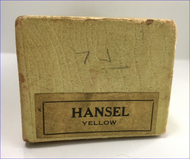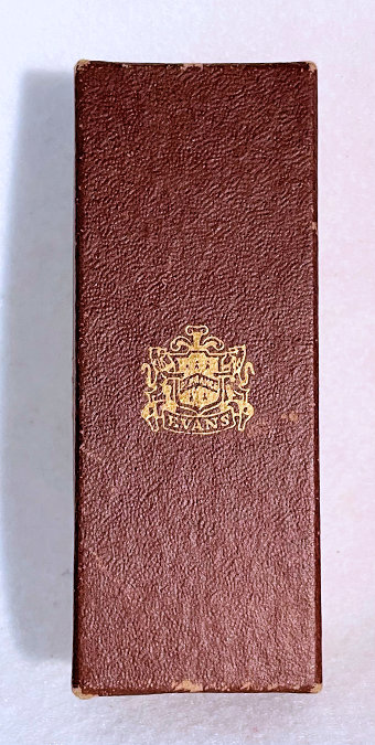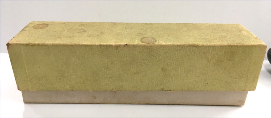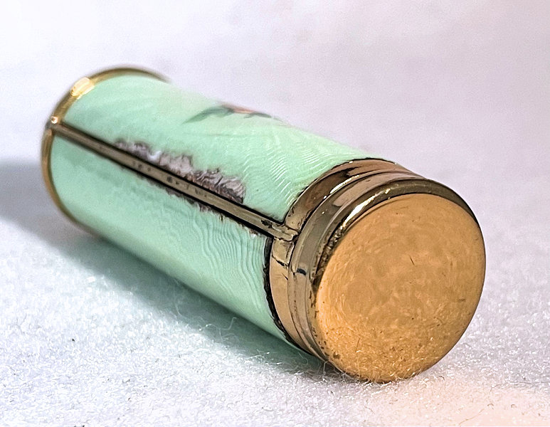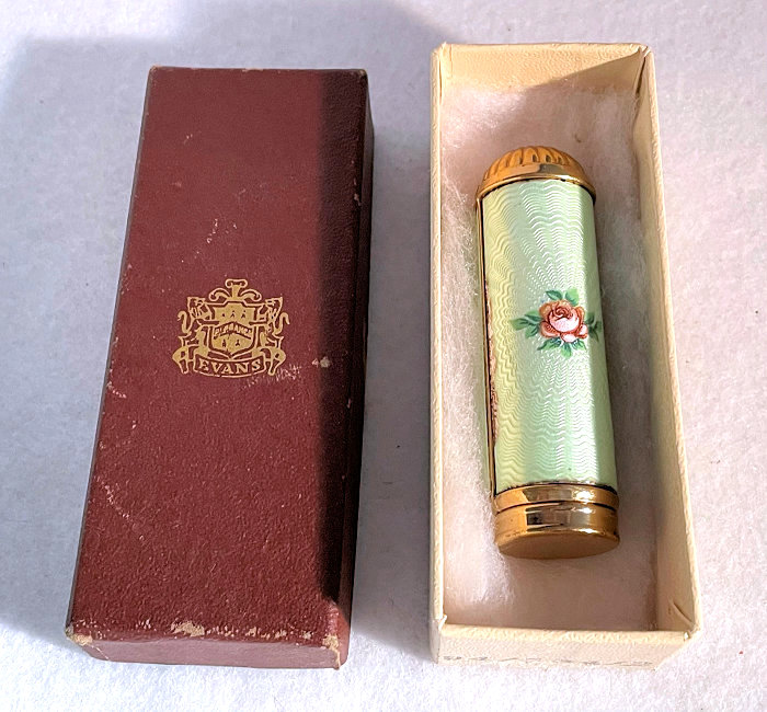 This is a pretty little lady's enamel enamel guilloche lipstick holder which has never been used. However, it does have damage to both side probably from being dropped. It was in a box marked "Evans" on the lid; however, I am not sure this is original as the lipstick itself does not have any markings. The lipstick tube twists up to extract the lipstick and is in excellent working condition. Price is based on condition. Measures 2-1/2" long x almost 3/4" diameter. Box is 3-3/4" x 1-7/16" x 1-1/8" deep. (Click on pic for more photos.) |